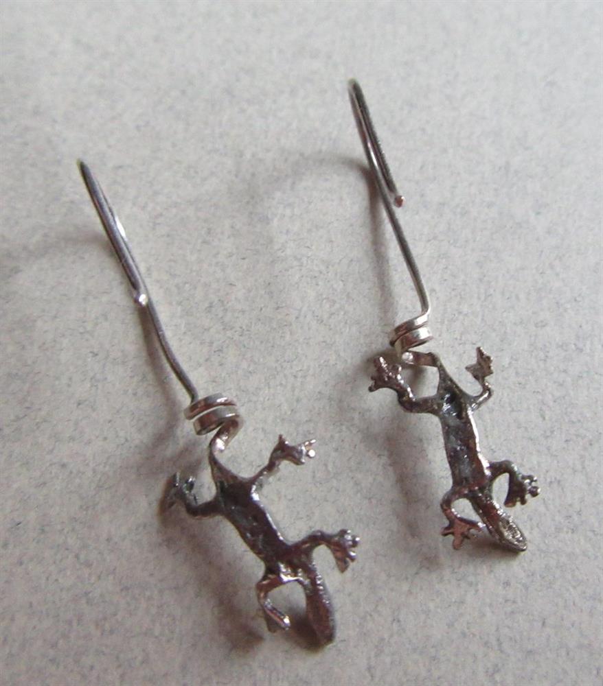 Never worn tiny sterling silver lizard or gecko pierced earrings. They measure 1 1/2" long. They weigh 1 gram. Never worn and in excellent shape. Unmarked, but I know they are sterling. Not real old, but not new either.