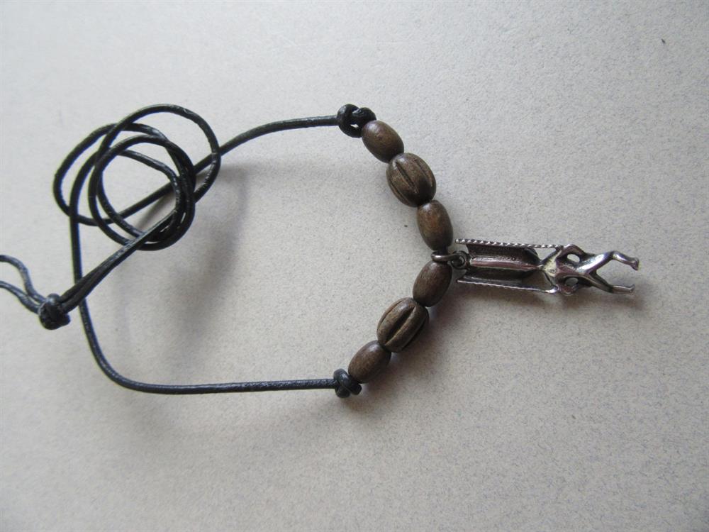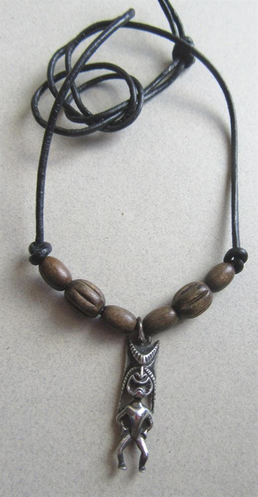 Sterling silver tiki pendant necklace with carved wood beads on a rawhide style cord. Hand made. The tiki pendant measures 1" long. This was made by my Mom back ins 2000. No market on the pendant, but they were purchased by me and they are sterling silver. Excellent shape.