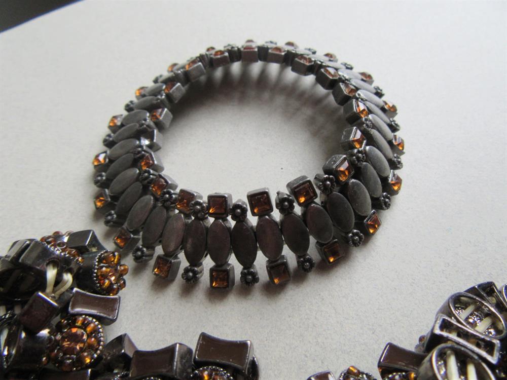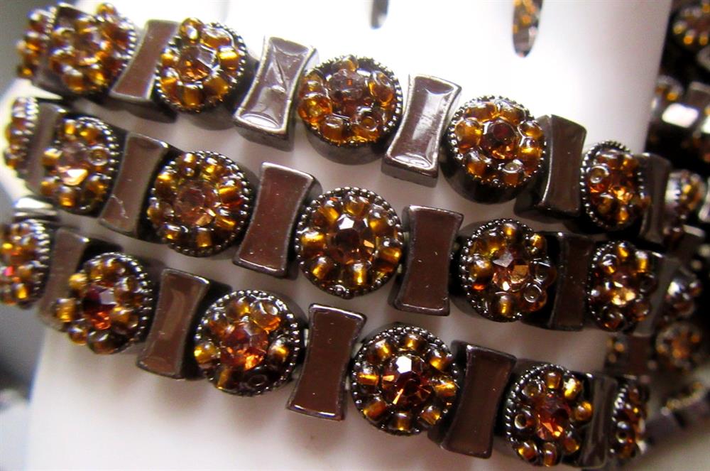 Nineteen taupe rhinestone stretch bracelets for rhinestone harvesting. The centers have taupe rhinestones and it is surrounded seed beads. Gunmetal color metal spacers in between. A few may be missing seed beads. There are 18 all alike and one different one. Strictly being sold as a rhinestone harvest lot for crafting.