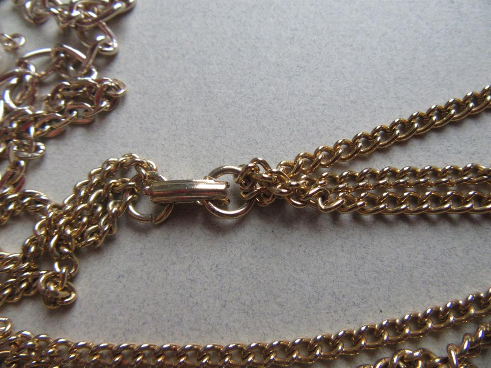 The faux pearl necklace has lightweight aluminum chains and measures 24" long and the tassel is another 4" long. The spring clasp on this necklace is a little dark and does not appear to be original. No big deal. It also has a chain extender at the end. And last is the filigree teardrop pendant necklace which measures 24" long and has a 6" long pendant tassel. All in great shape.