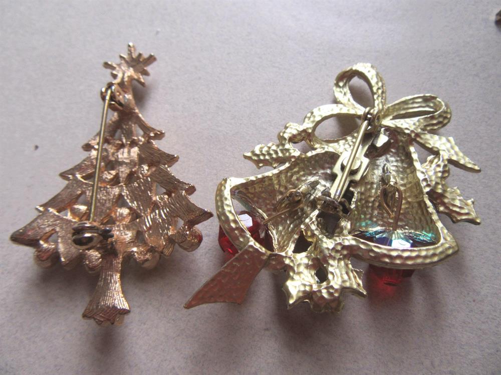 Two vintage rhinestone Christmas pins. Some stones on these pieces look replaced. I pointed out one of the stones. No big deal and they look fine.