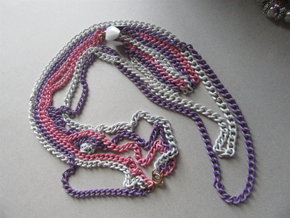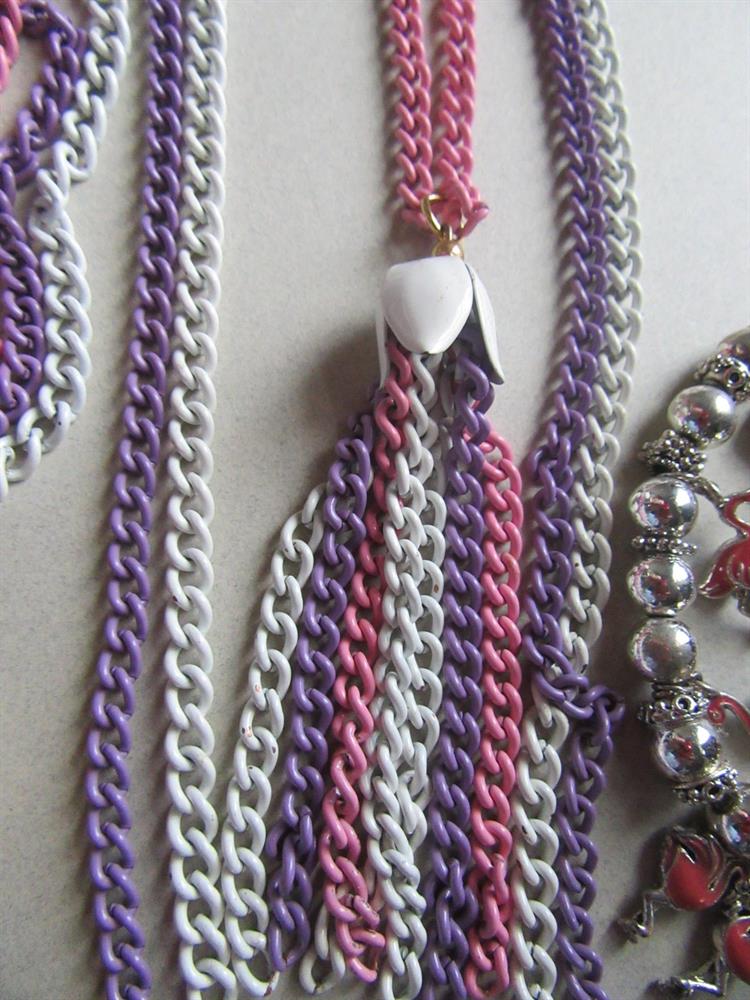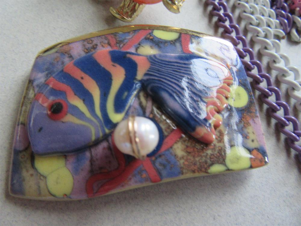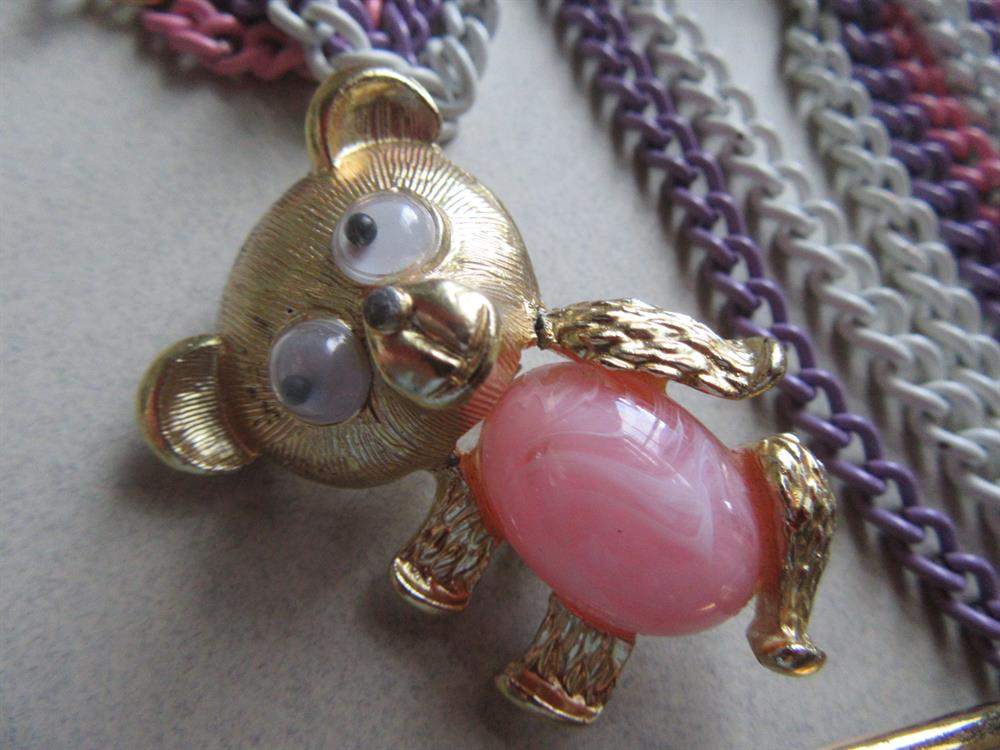 vintage jewelry lot. A yummy Easter colors metal chain fringe necklace, a google eyes bear pin with lucid belly, a very pretty artisan hand painted ceramic fish pin with genuine freshwater pearl, and throwing in the newer flamingo stretch bracelet.