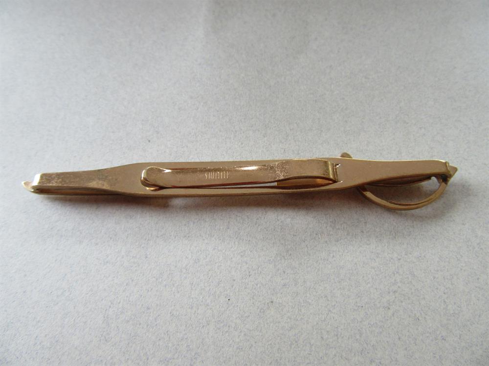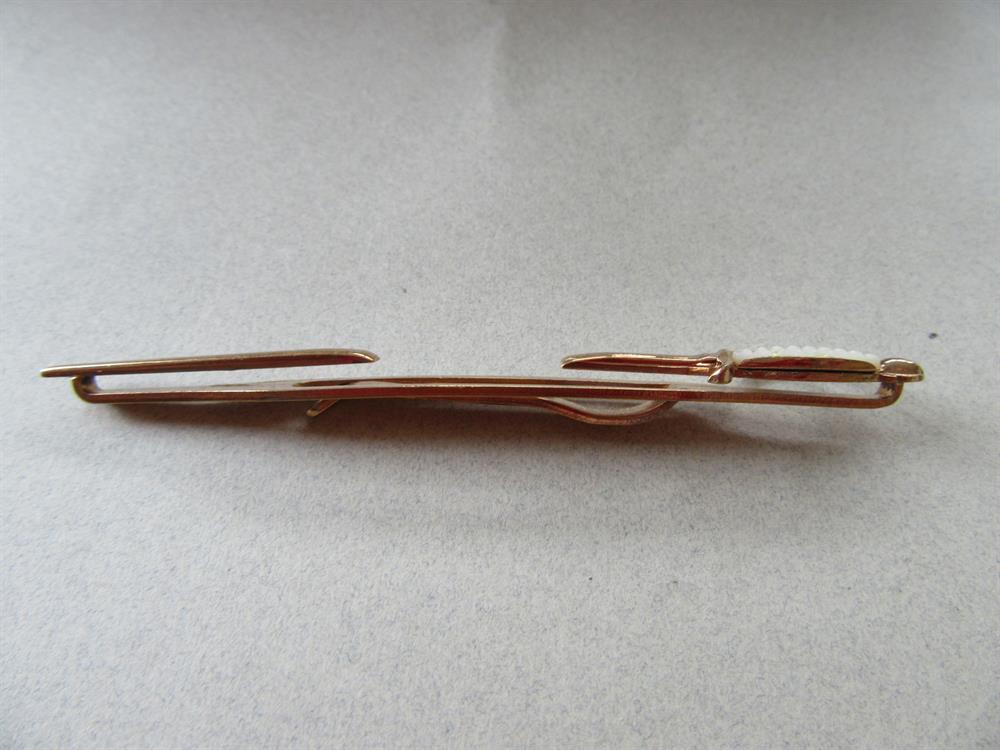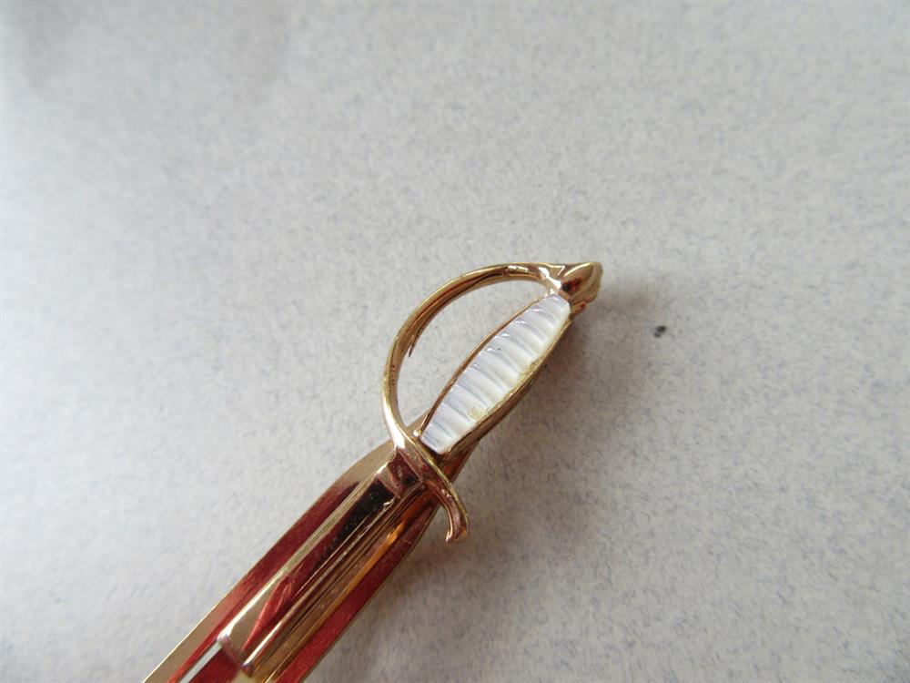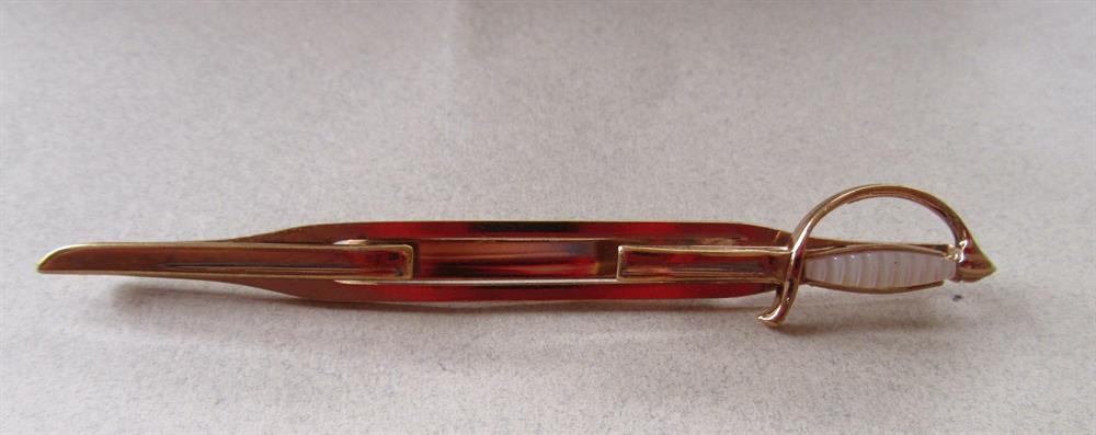 1940's Swank signed tie bar with a mother of pearl handle. This tie bar gives the appearance of the sword going through the tie. Very cool.