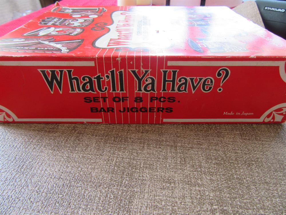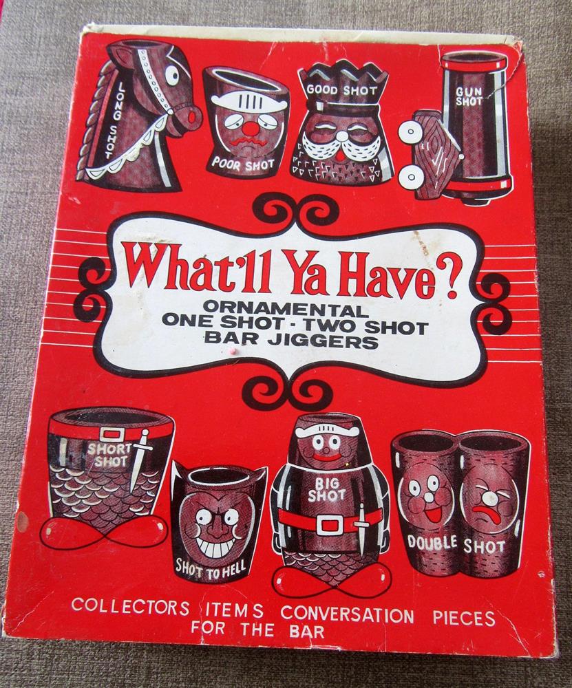 Vintage 1950's "What'll You Have" fun shot glass set in the original box.