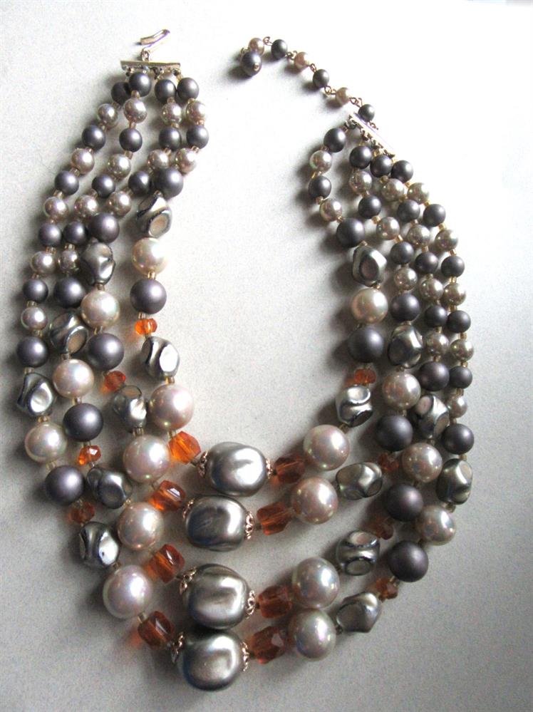 Vintage 1950's multi strand necklace with glass beads and faceted orange crystal beads. The hook is signed Japan. The SHORTEST is 13" long, not including the hook or bead extender which will give you more length.