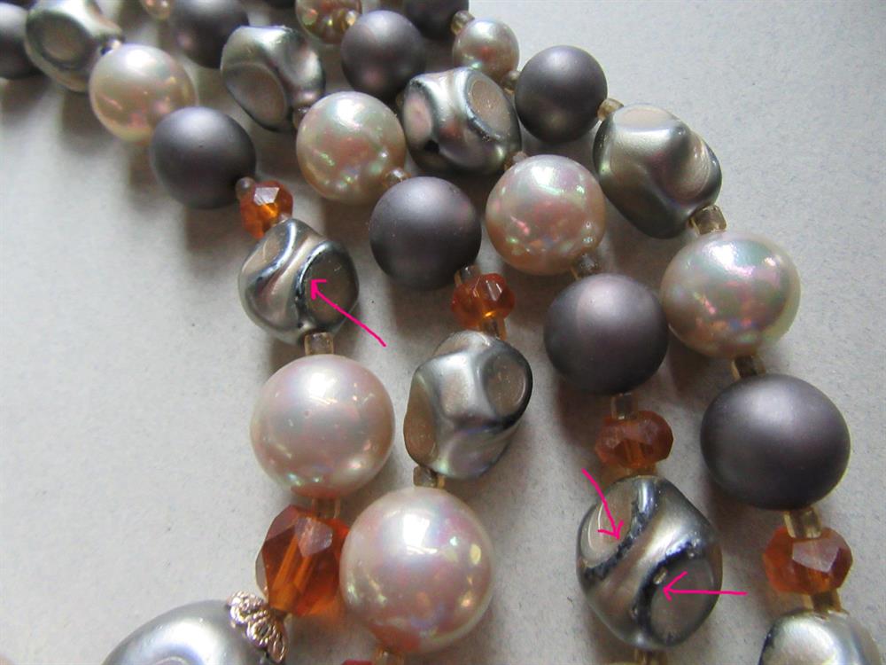 There is some finish wear to the edges of some of the twisted beads. View 4th photo. This is not bothersome esthetically. Sold as is.