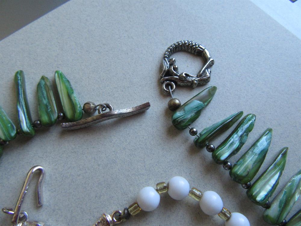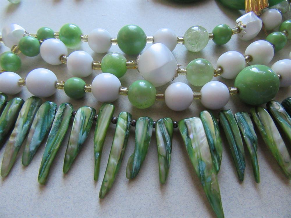 Vintage 1950's Greenland white multi strand necklace, The SHORTEST strand measures 14 1/2" long, not including the hook or bead extender. Clasp is signed Japan. Also a genuine mother of pearl spiked newer necklace which measures 22" long with a toggle clasp nd a pair of green lucre hoop earrings. All in excellent shape.