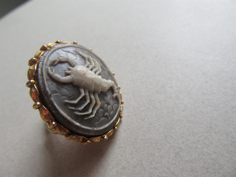 Vintage 1970's molded lucite scorpion adjustable rng. These rings were astrology themed rings that were big in the '70.s The front measures 1 1/8" across. Great shape.