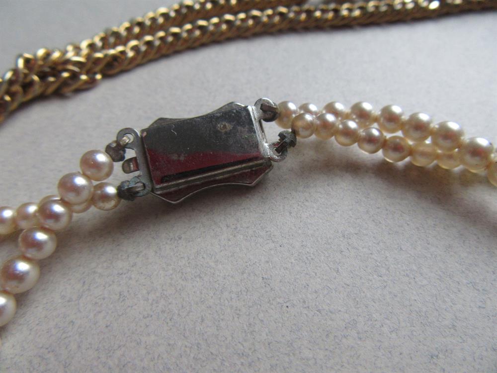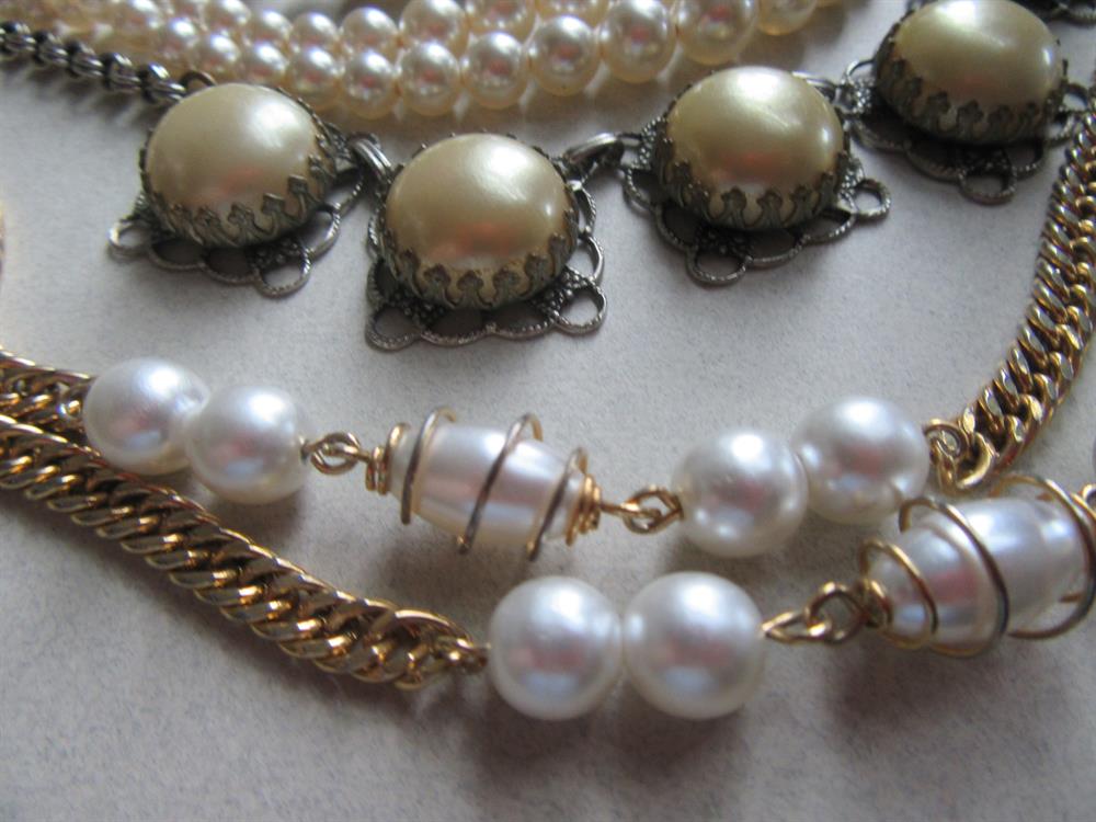 All in great shape except the 1950's glass pearl necklace with the rhinestone clasp has a tad of greening on the hardware on the end. No big deal. See last photo.