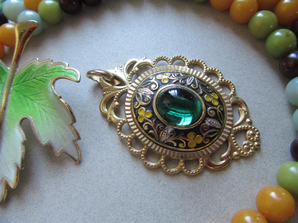 Damascene pendant with green glass cabochon - 2 1/4" long including the bail.
