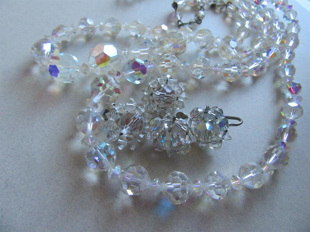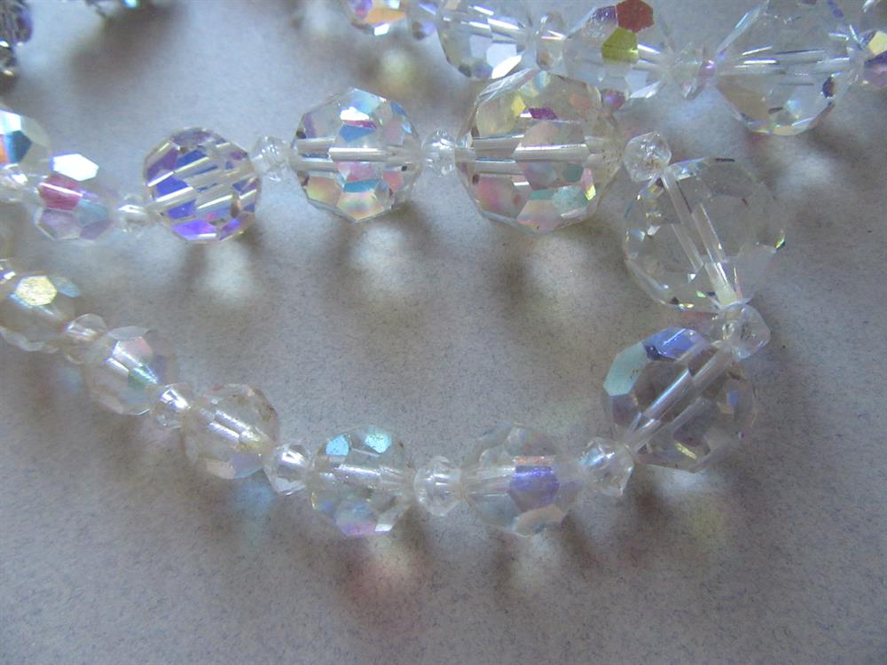 Vintage aurora borealis crystal necklaces and earrings for repurposing. From tip to tip is 18" the other is 23". Two pairs of earrings as well. Which are totally wearable. The necklaces hang rumply. so they are being sold as a craft lot. Beads are in decent shape!