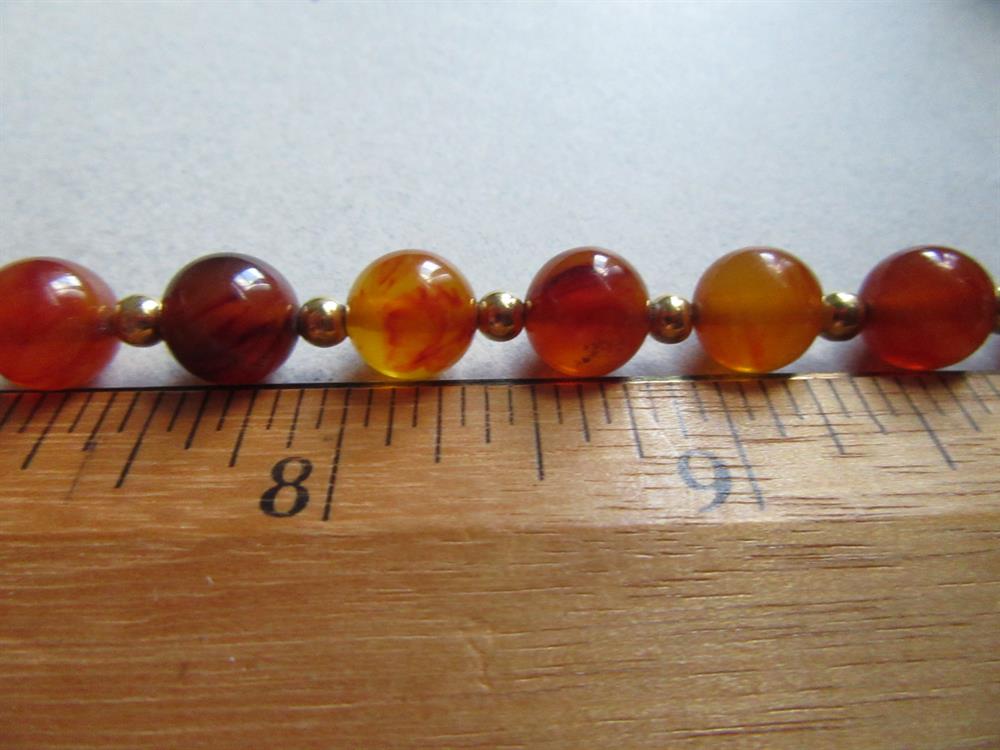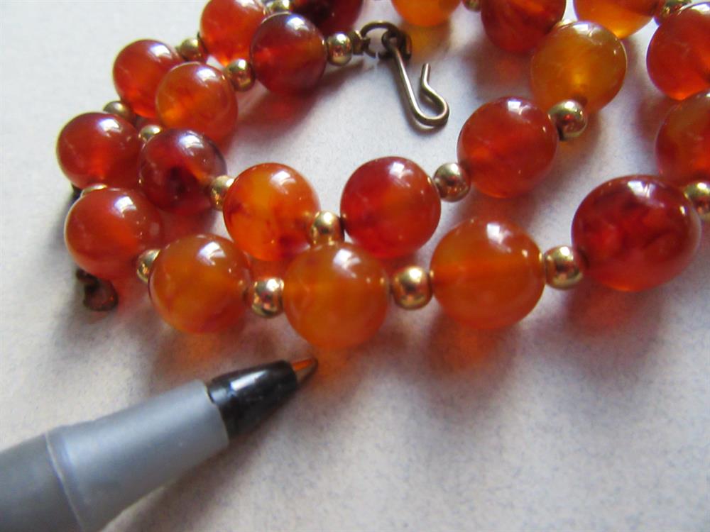 Vintage genuine bakelite tortoise color beads. Photos were enlarged to show details. There are 24 beads in total. I photographed a pen next to one of the beads so you can gage the size. This necklace is missing the end bead and the chain has patina. The brass metal spacers are fine.
