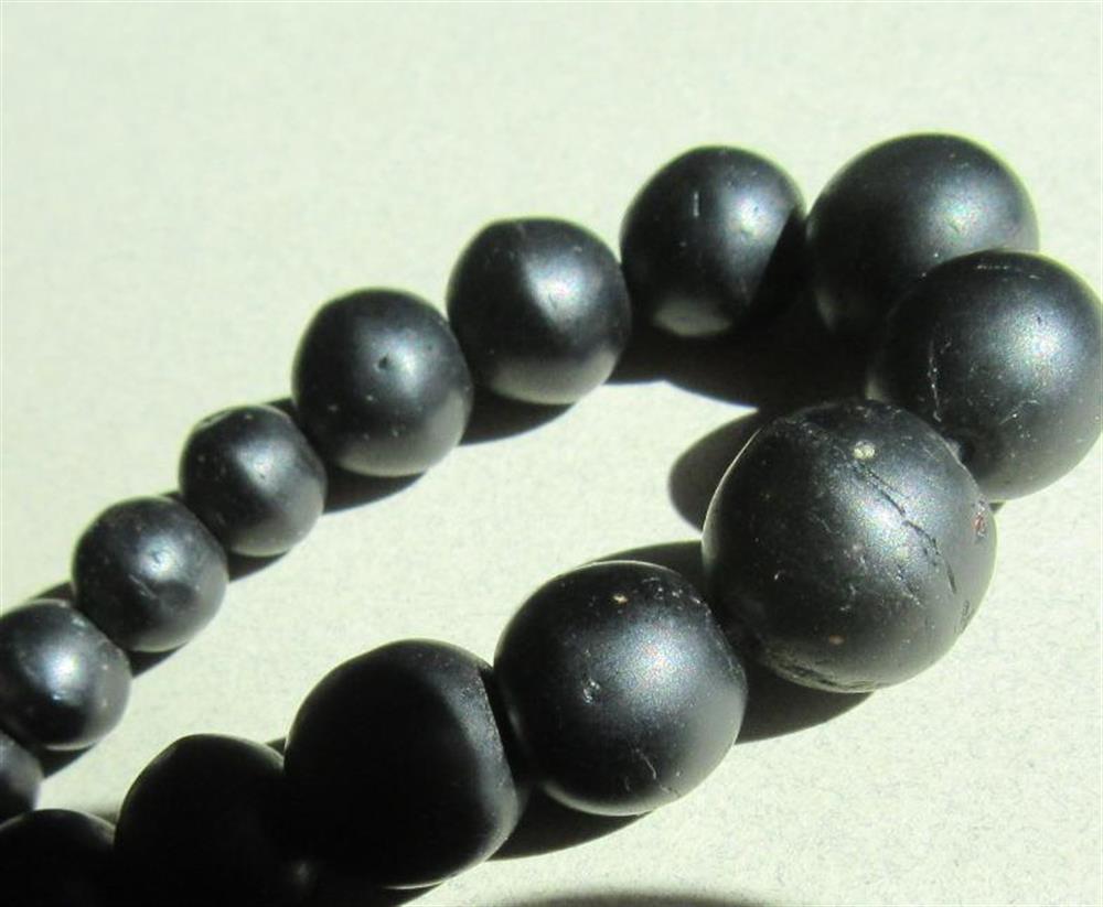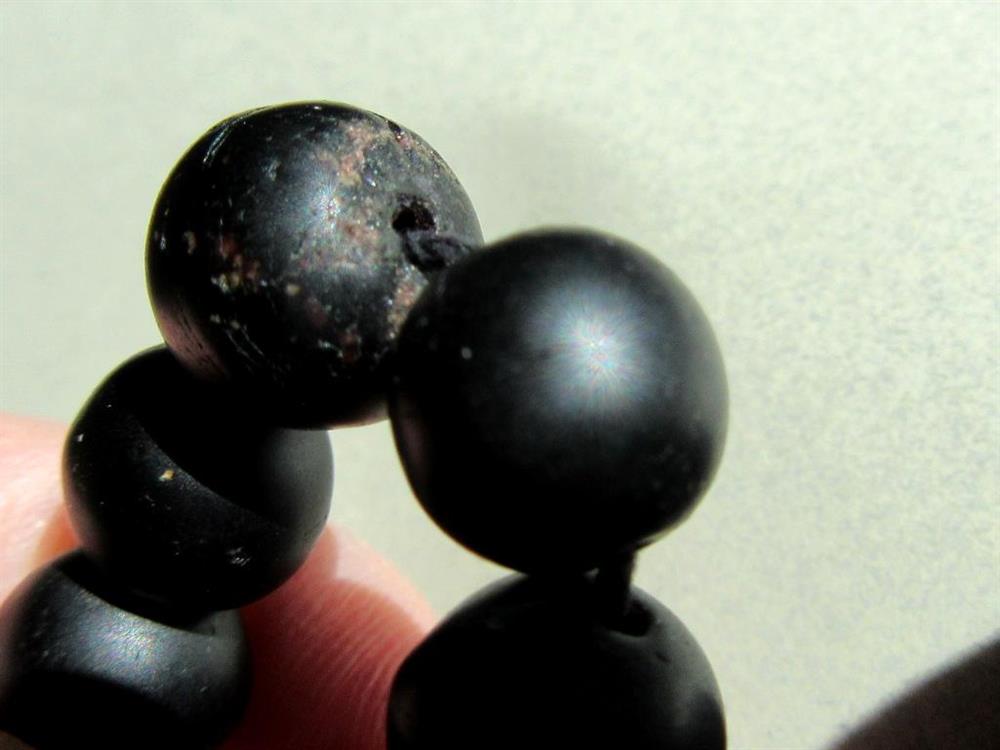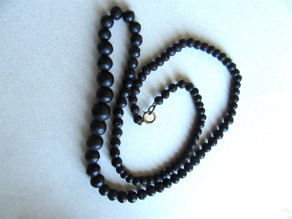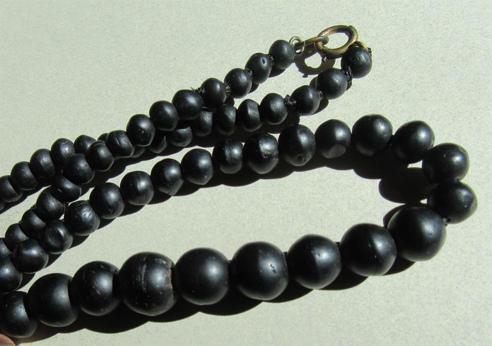 VERY old necklace with unusual smooth, matt, black beads with a partial 10k gold clasp. I saw partial because I think one of the rings is not gold. . I tried to research this necklace without coming up with a real answer. Not sure if it is Gutta Percha, Vulcanite or Bog Wood or none of them.