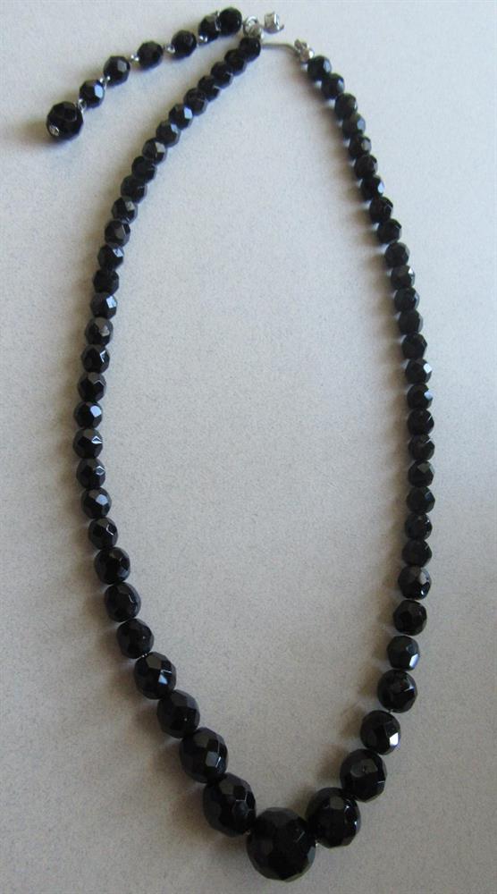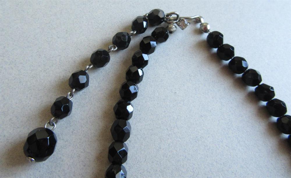 Vintage faceted black glass necklace strung on chain. It measures 16" long with a 2 3/4" long bead extender which will give you more length.