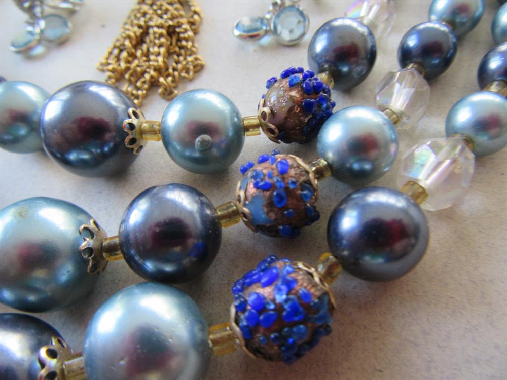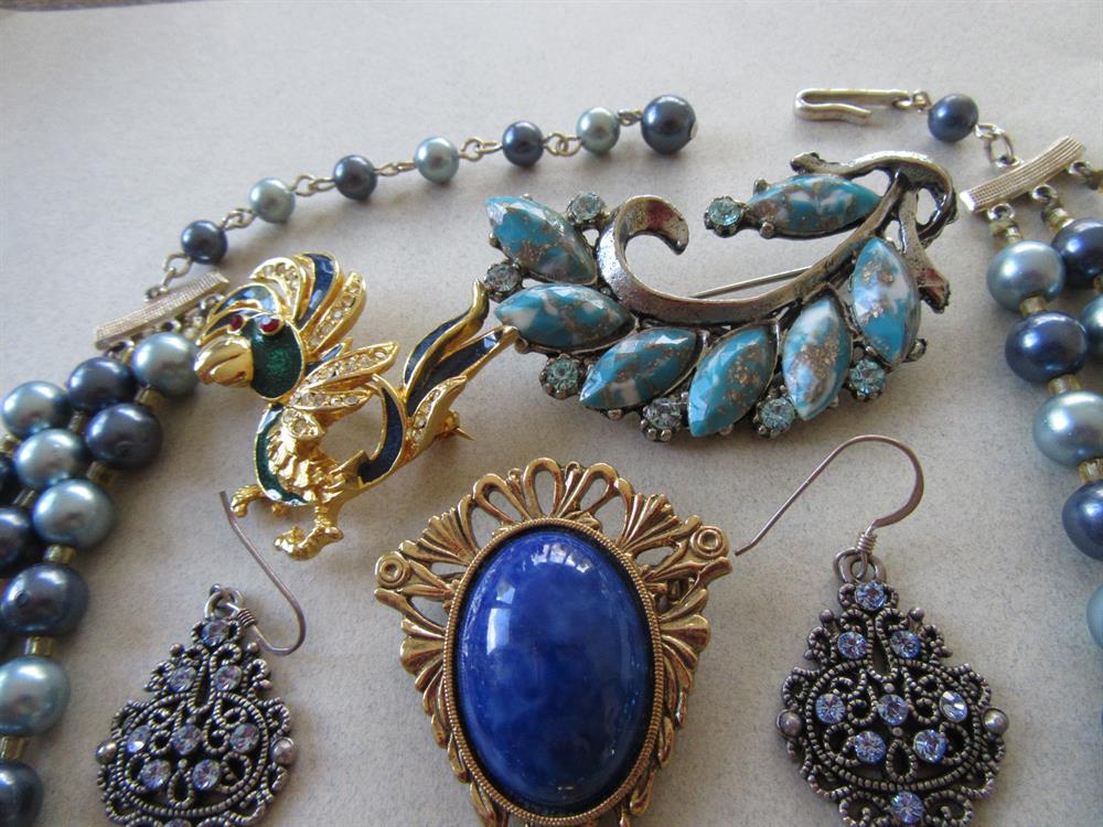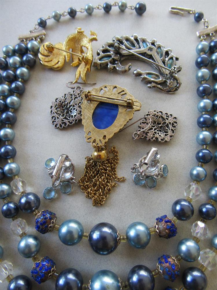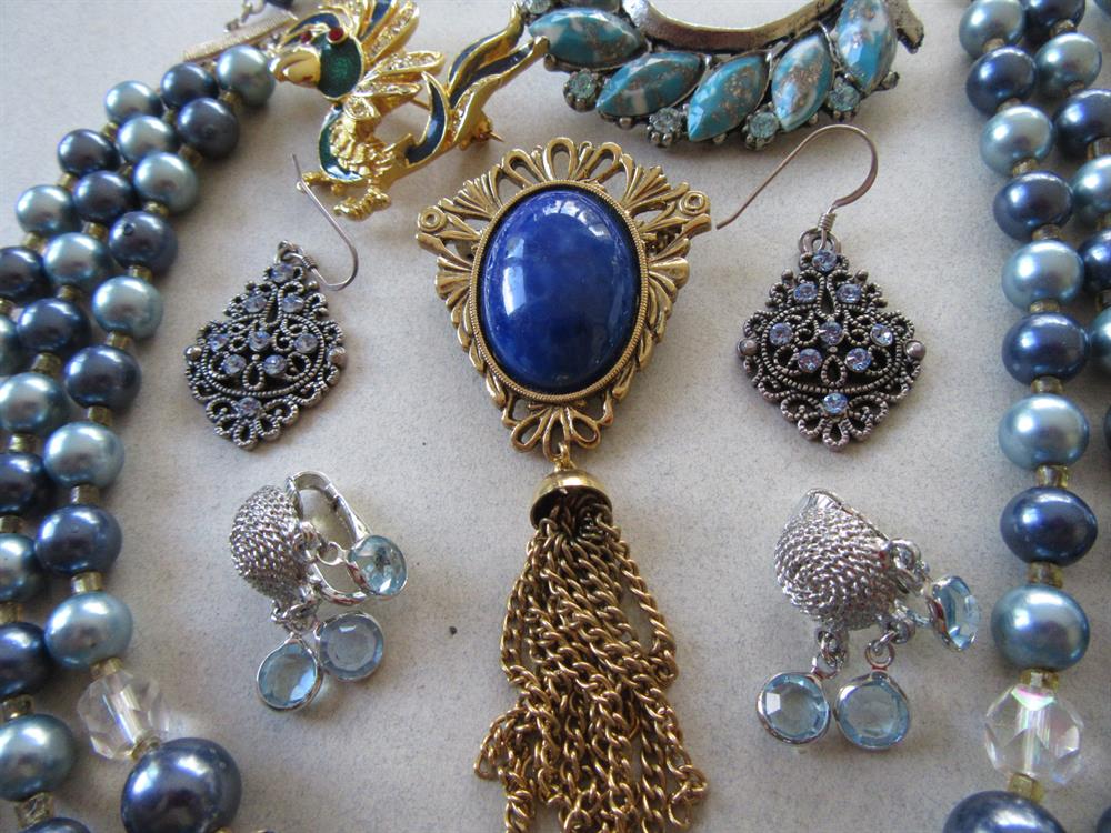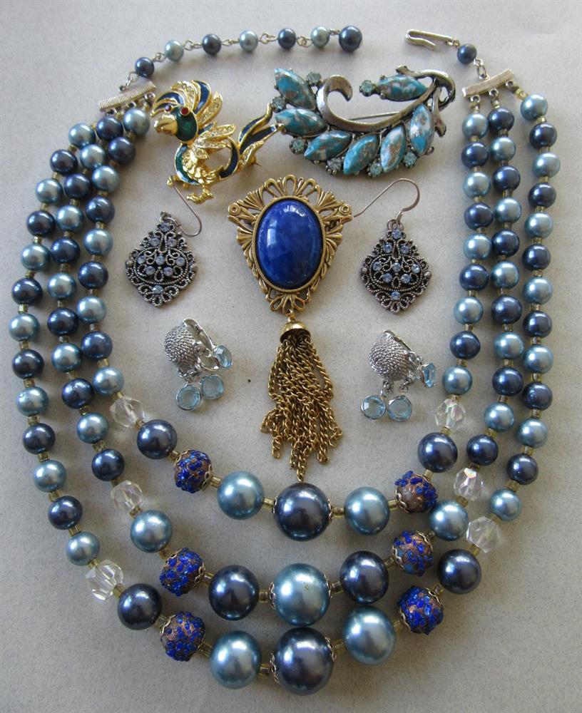 Vintage Blue Jewelry Lot Beads Pins Earrings