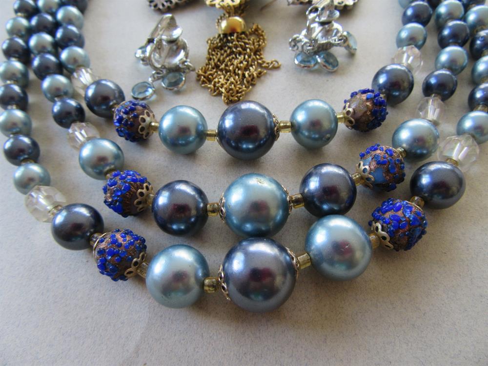 Vintage jewelry lot. A triple strand blue glass bumpy beads necklace, a blue glass tassel pendant, two pairs of earrings one clip, one pierced, a lucite and rhinestone pin, and a newer rhinestone bird pin. All in great shape!