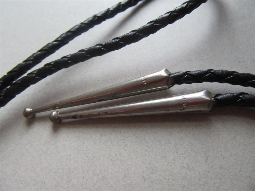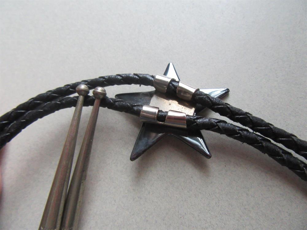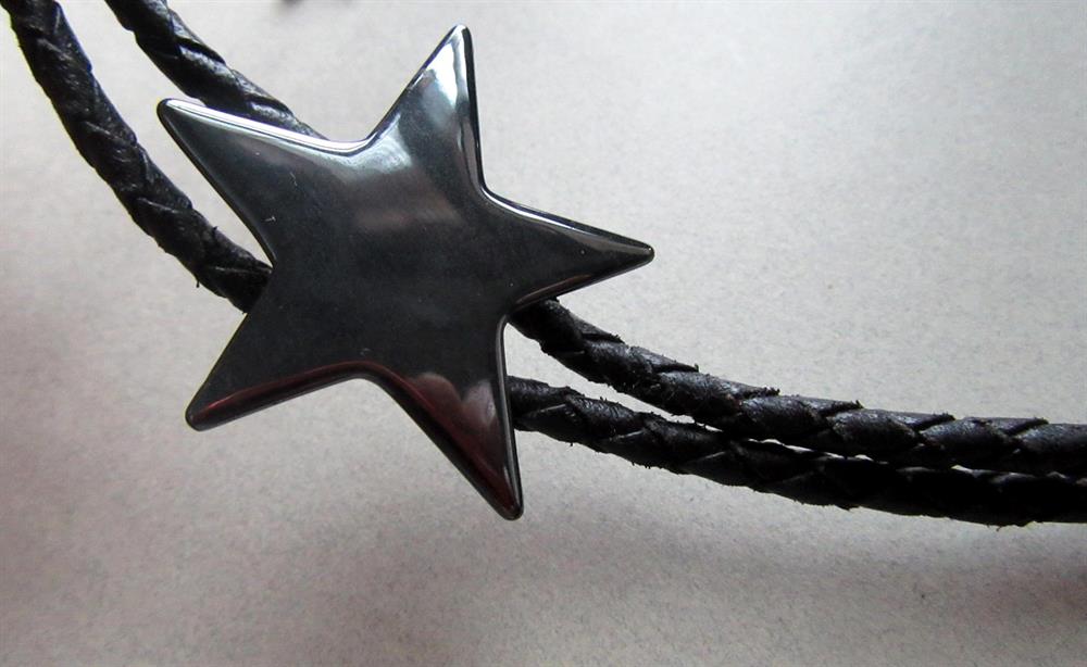 Vintage bolo tie with a star shaped hematite stone slide. The tie measures 38" long in total. The star measures 1 1/2" across. The braided tie does have some wear. View all photos. Sold as is. Still looks great to wear!