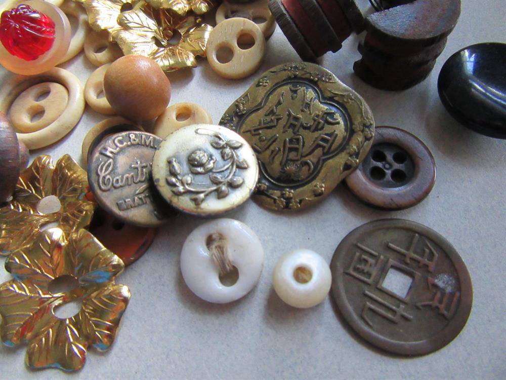 Vintage and antique button lot and some doo dads. Bone, celluloid, wood, metal etc... Some bit and pieces thrown in. This lot has not been cleaned and maybe a bit dusty.