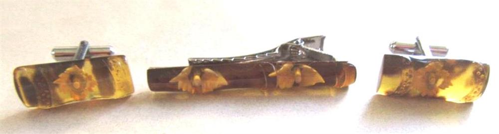 Super fab vintage reverse carved lucite? cufflinks and tie bar set. The design is a bamboo pattern that has an Asian flair.