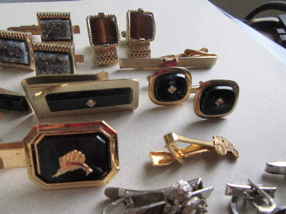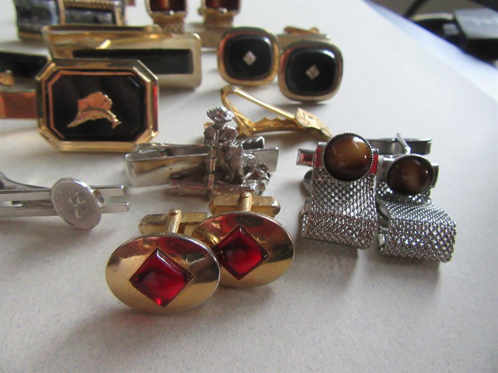 Men's vintage jewelry lot. Lucite, glass, faux onyx and more. Tie bar, cufflinks and a money clip. Small rhinestone pair in the foreground is marked Anson. Good shape. Some MINOR wear.