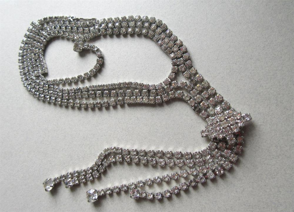 Vintage long drippy rhinestone waterfall necklace. pointed out in the photos. Otherwise in great shape! It measures 17" long from tip to tip not including the hook. The centerpiece drop is approx., 6" long. It has a few darker stones which I pointed out in the photos. Otherwise in great shape. Sold as is.