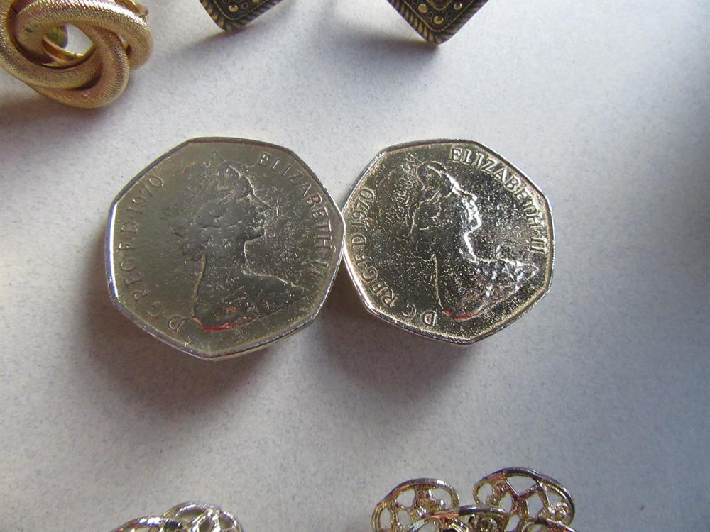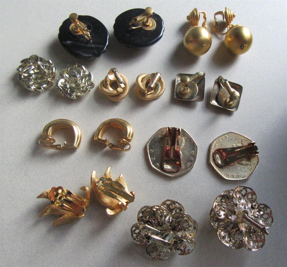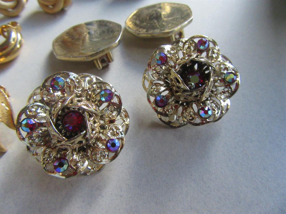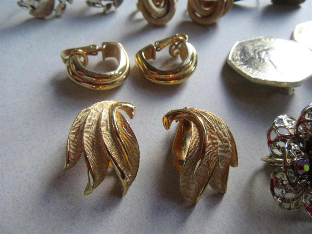Most are signed except the ball gold tone earrings on the upper right corner of the photo, the gold tone leaves, and the faux coin Queen Elizabeth pair.