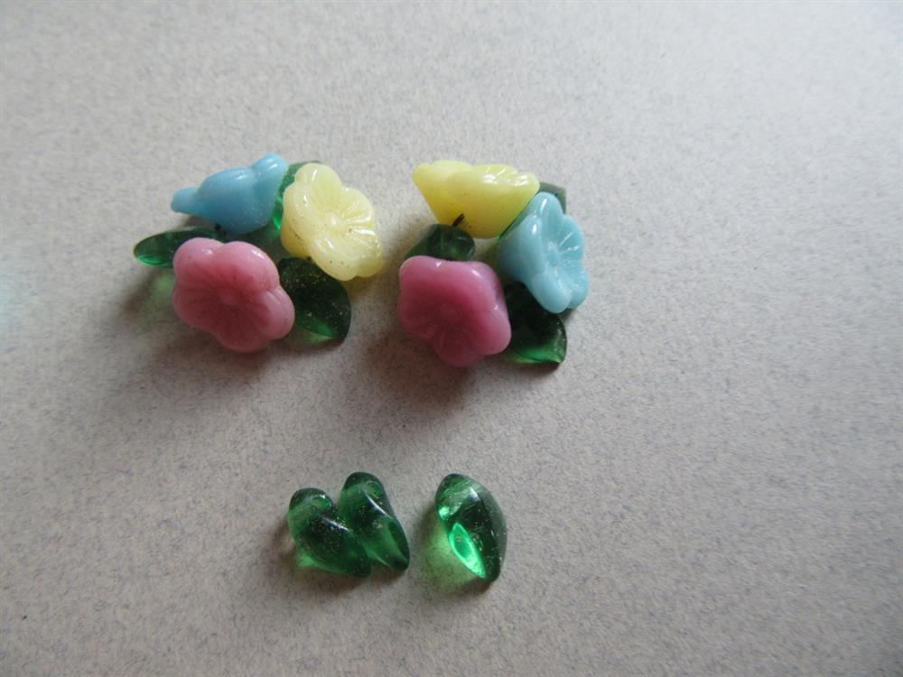 Vintage very sweet glass flowers and leaves lot. These came off a necklace that was marked Japan. There are 10 pink, 10 blue, 6 yellow loose flower beads, 8 dark green leave beads, 9 light green leave beads and 3 TINY dark green leave beads.