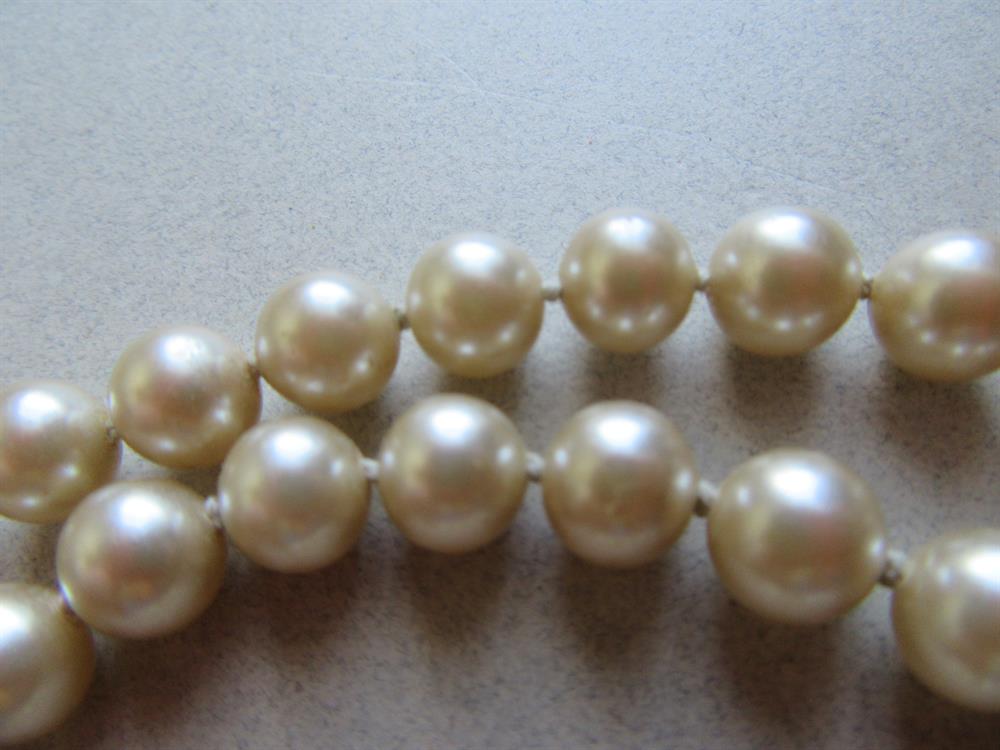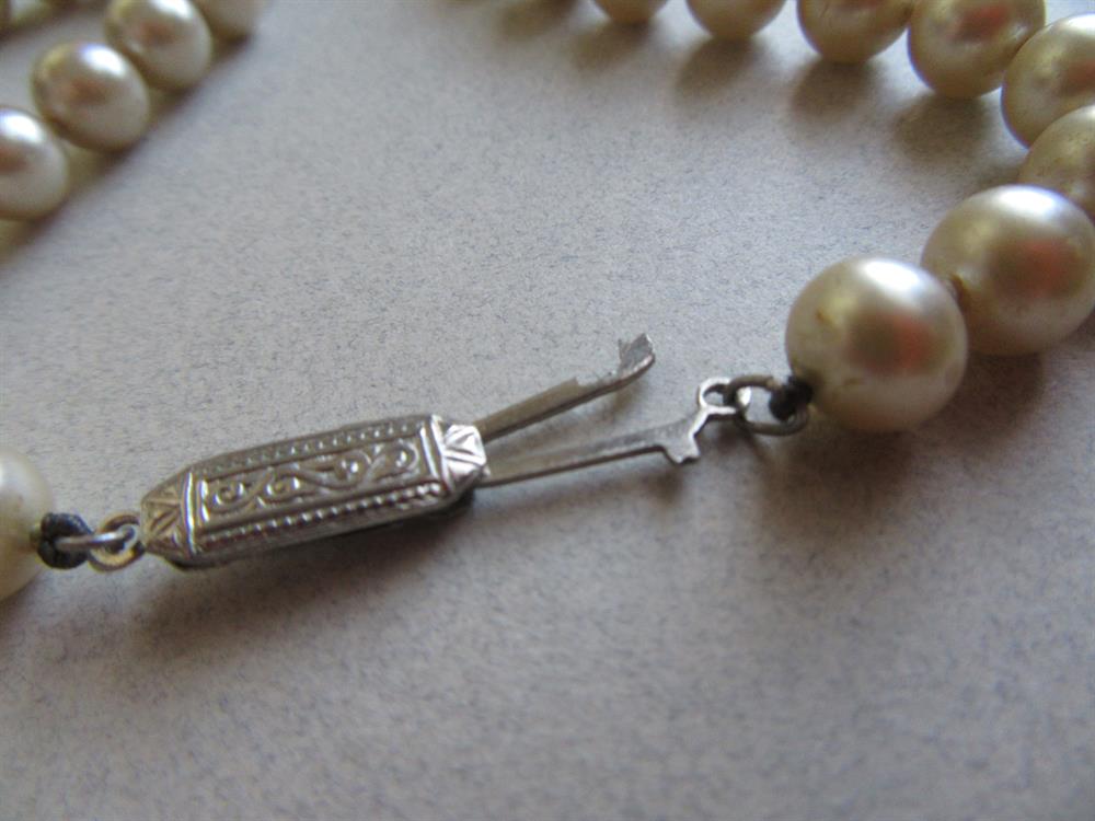 Vintage glass pearl necklace. It measures approx. 28" long. Art deco "granny" interlocking clasp. Can use a cleaning.