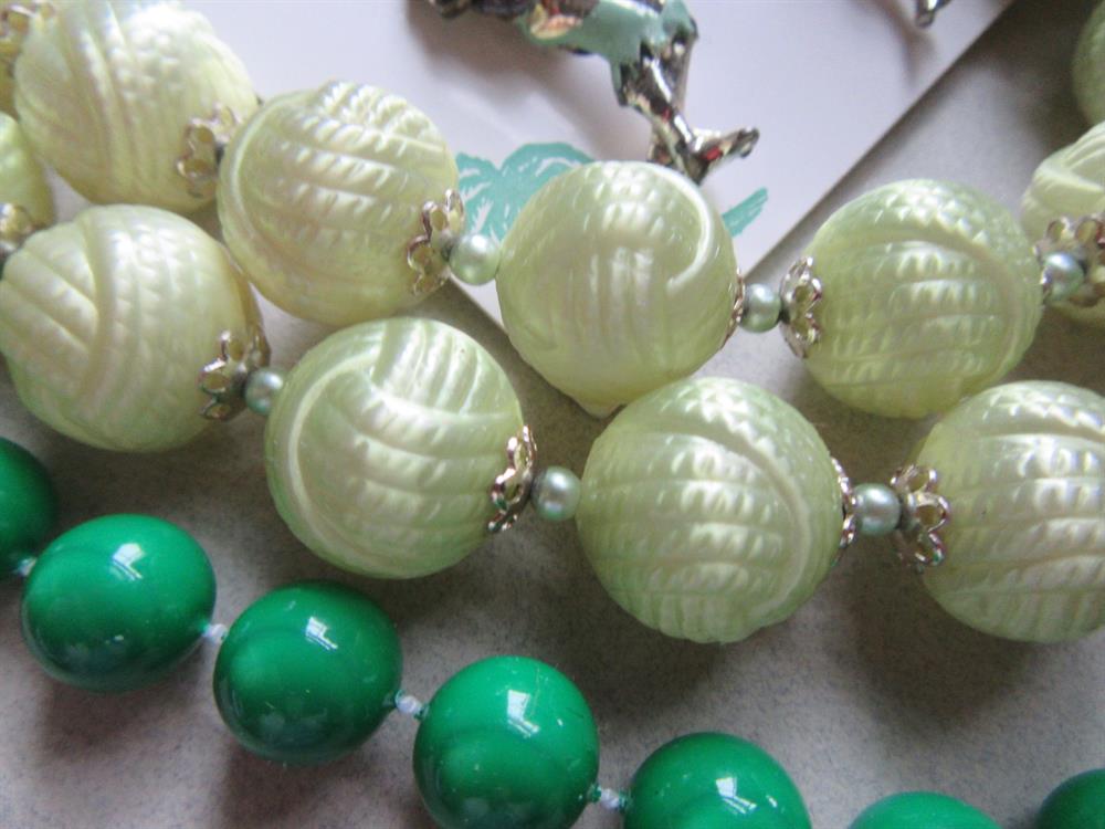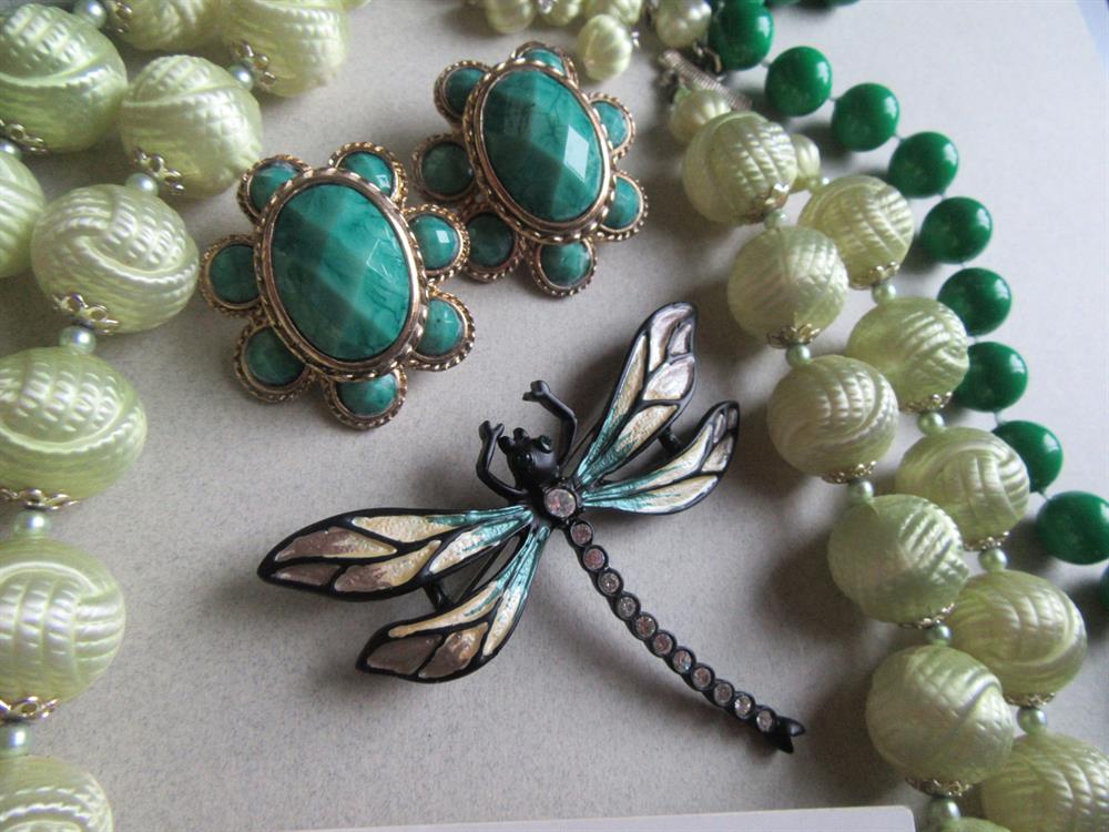 Vintage green jewelry lot. Two necklaces (the double strand is VERY light weight) and a 1950's Calypso musician scatter pin set on the original card. The green clip earrings are 1980's and the rhinestone dragonfly pin is newer.