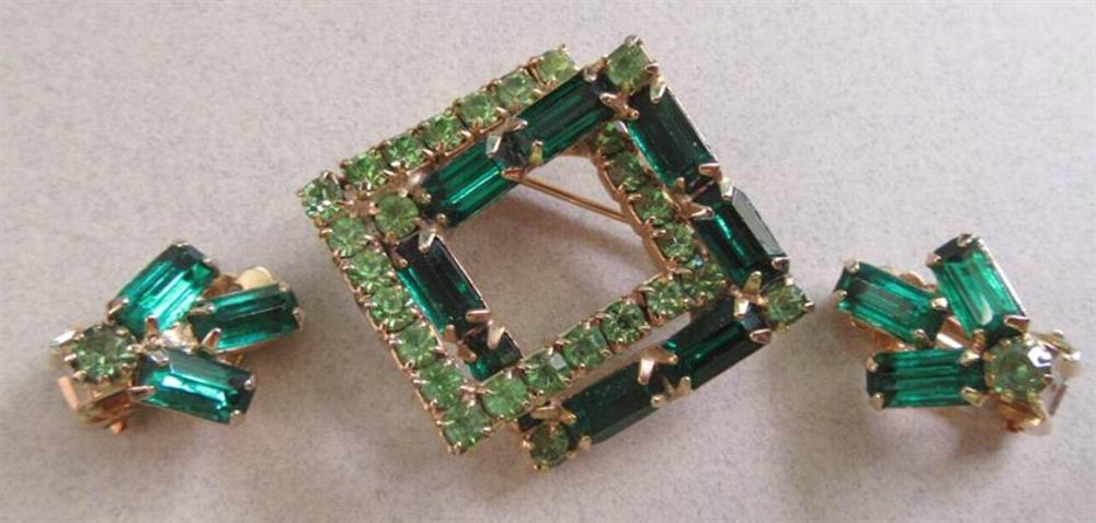 Vintage green double geometric rhinestone pin and matching earrings. The pin is small and measures 1 1/2" long. One of the earrings needs to be tightened. They are all in excellent shape except for the need to tighten one earrings.
