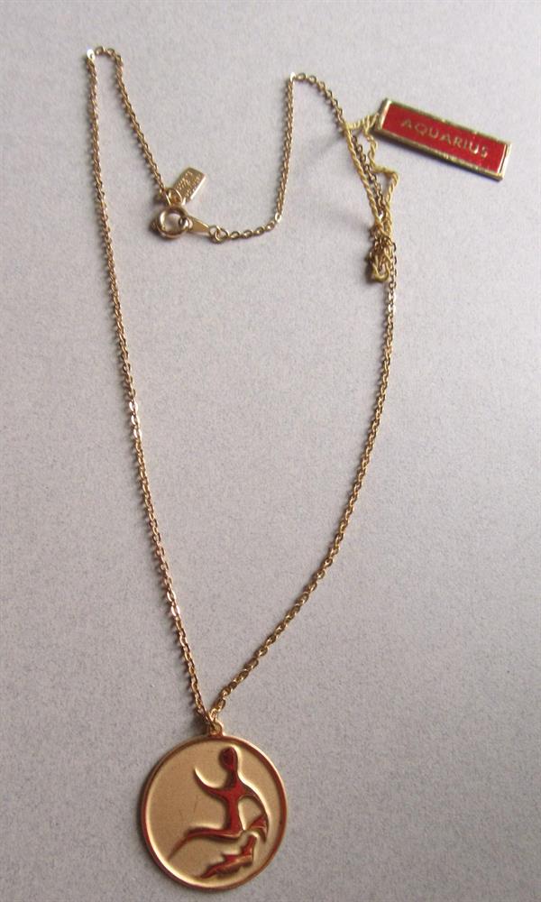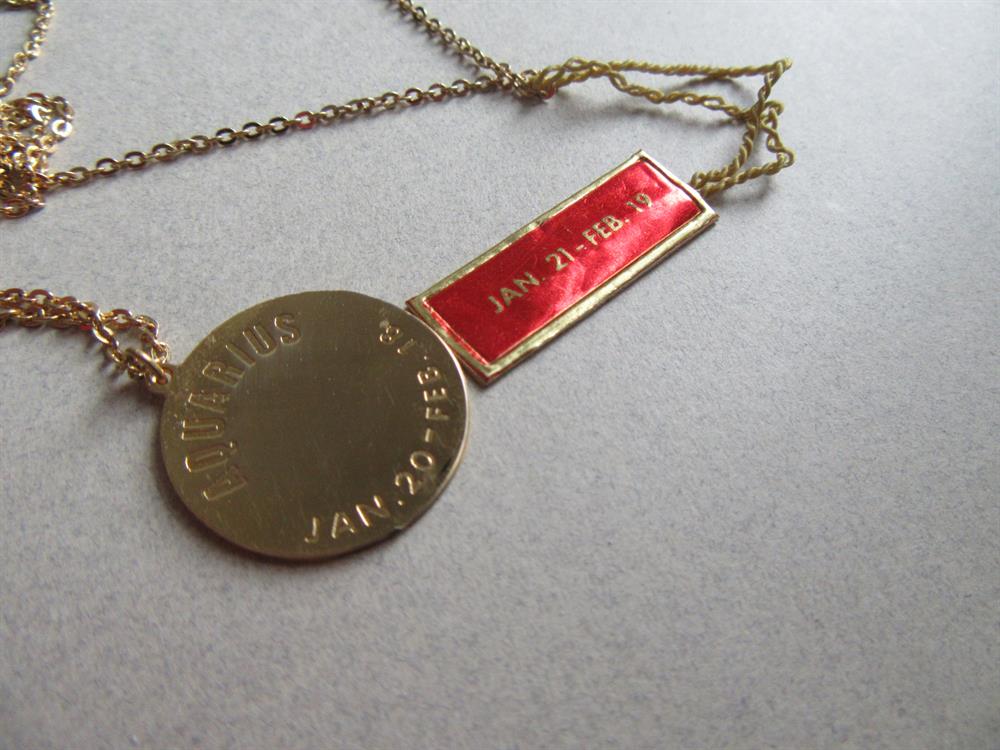 Vintage Hallmark signed Aquarius gold tone necklace. The back of the pendant has the dates, but oddly those dates do not match the original foil tag that was on the necklace. Very strange.