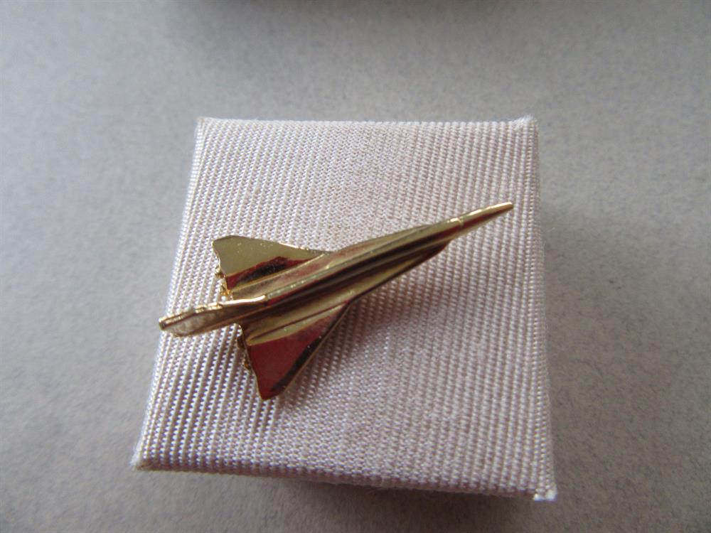 Vintage jet tie tac in the original box. It measures 1 1/4" long.