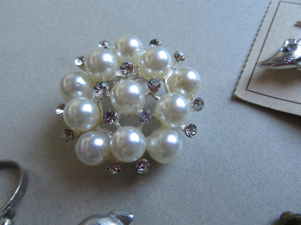 The faux pearl pin with rhinestones has never been worn and is not a vintage piece.