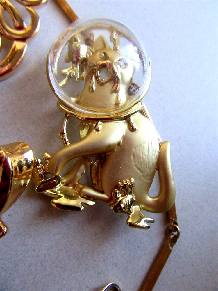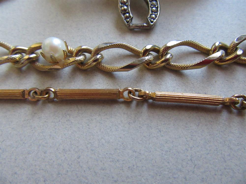 Avon. It measures. 3" long and has a faux marcasite style center. The gold tone section chain is 30" long and the faux pearl bracelet measures 7 1/2" long. Also a Danecraft never worn cat with fish bowl on his head pin. And the rest! All in great shape!