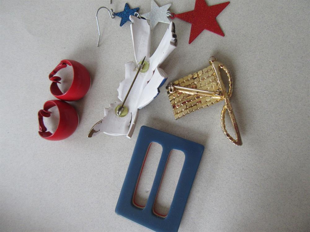 Vintage jewelry lot. An early plastic soldier pin in the center that has some wear, a layered red white and blue blucite buckle, a rhinestone flag pin, a pair of red metal hoop clip earrings and throwing in the newer sparkle star pierced. earrings