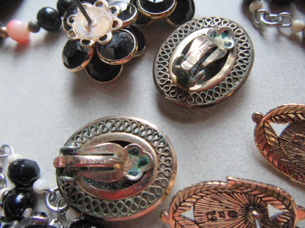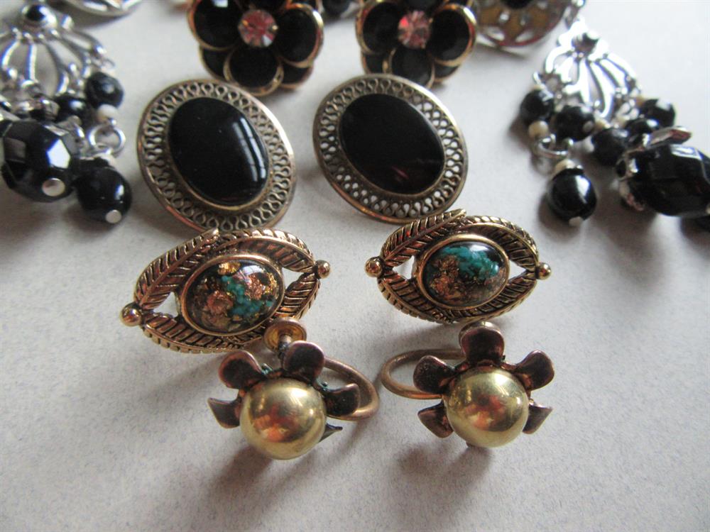 The faceted black glass large earrings are signed Western Germany and they have a chip on the back edge. The black lucite luster earrings are also marked Western Germany. The dangling clip earrings are newer. One pair of earrings are missing the clutch backs.