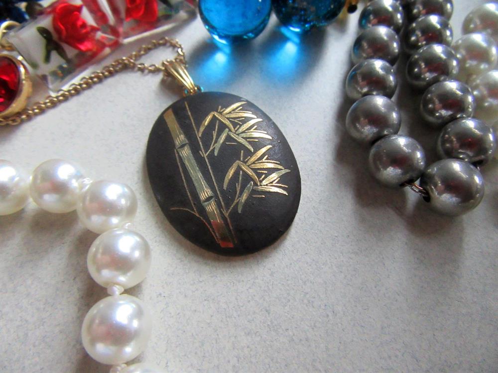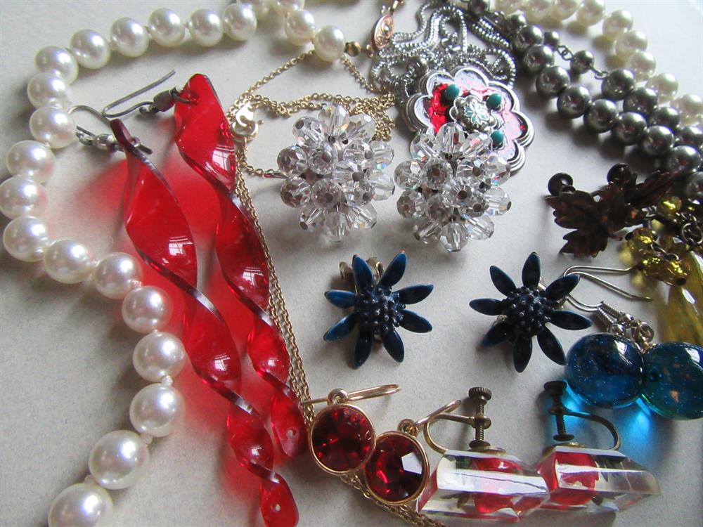 Long faux pearls, damascène pendant necklace, metal choker necklace and a red and blue enameled newer necklace. The red twisty pair of earrings on the left have a small hole at the bottoms where you can add a charm or whatever.