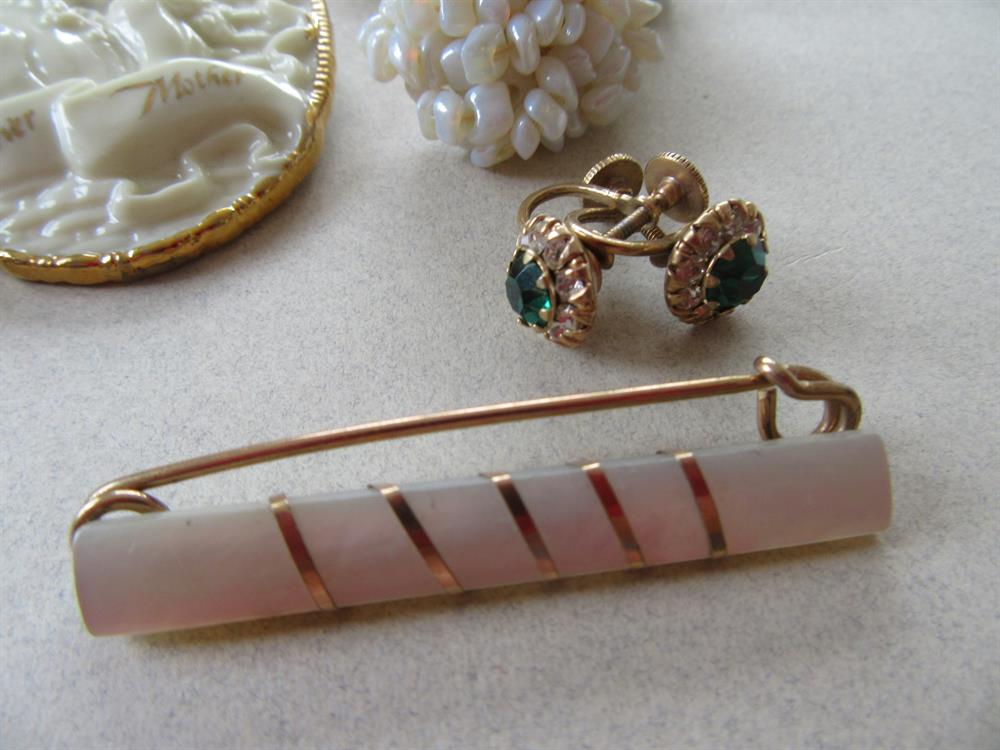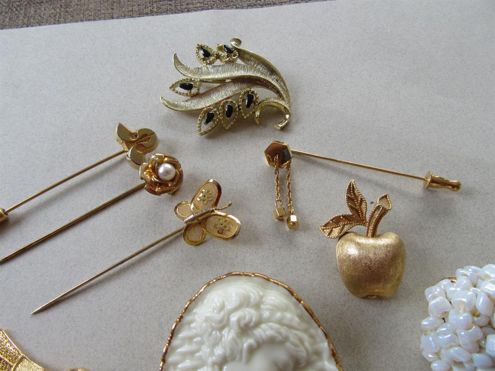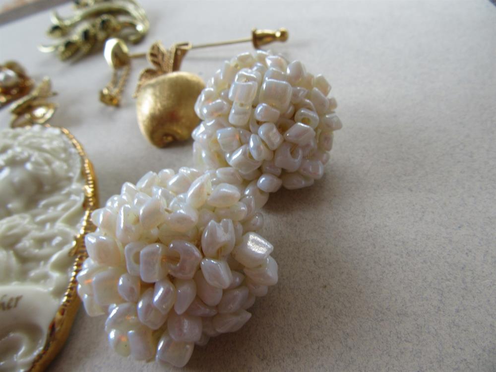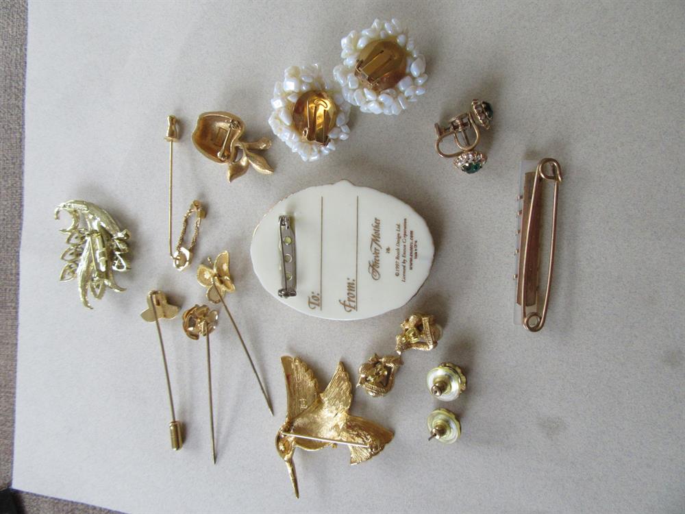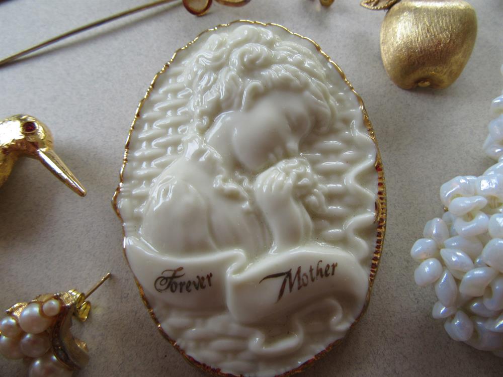 Vintage jewelry lot. The center pin reads "Forever Mother" (2 1/2" long) and the back it is dated 1997. Four stick pins, an Avon apple pin, Gerry's floral pin at the top pf the photo, hummingbird pin, pierced Richelieu faux pearl earrings, opalescent glass cluster clip earrings, older mother of pearl bar pin and two pairs of rhinestone earrings. (one pieced and inexpensive screw back.