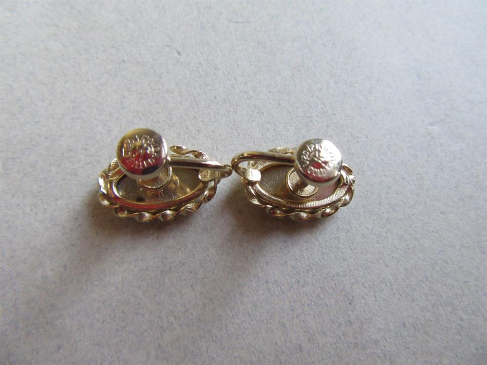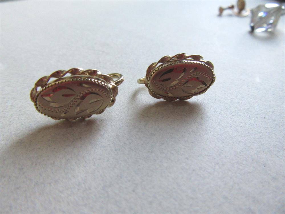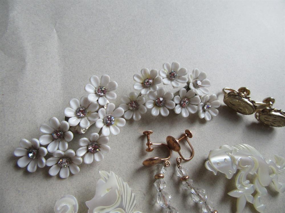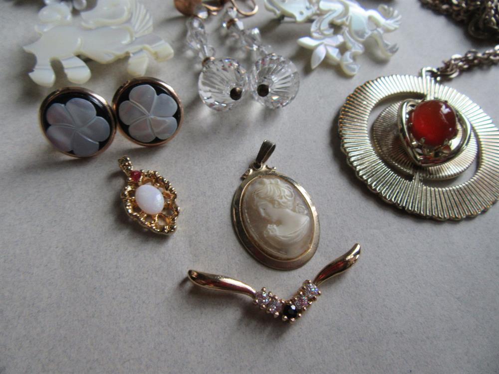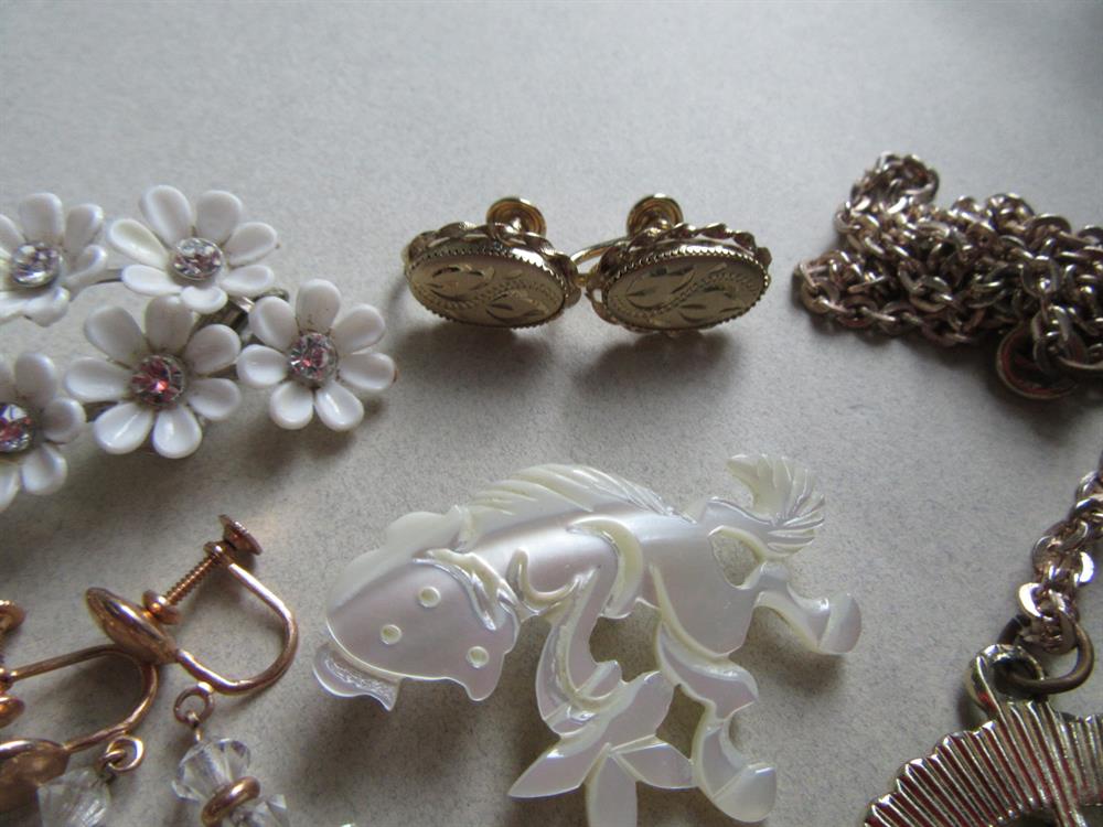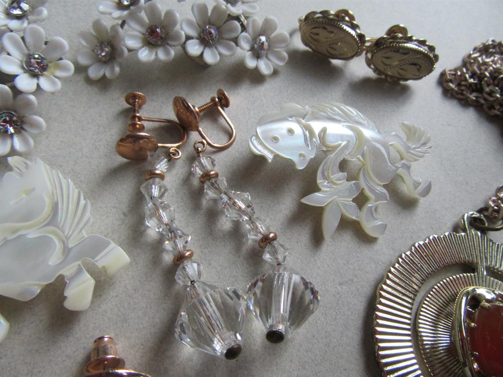 Vintage jewelry lot. Earrings that are clips, pierced and screw on, carved mother of pearl animal pins, (signed Made in Taiwan) orange glass pendant necklace that has an aluminum light weight chain and more. A NICE old pair of crystal earrings that you can always make into pierced earrings by removing the tops and replacing with ear wires. Some edge dings to the crystals. The oval etched screw back earrings are marked 1/20th 12k gold filled.
