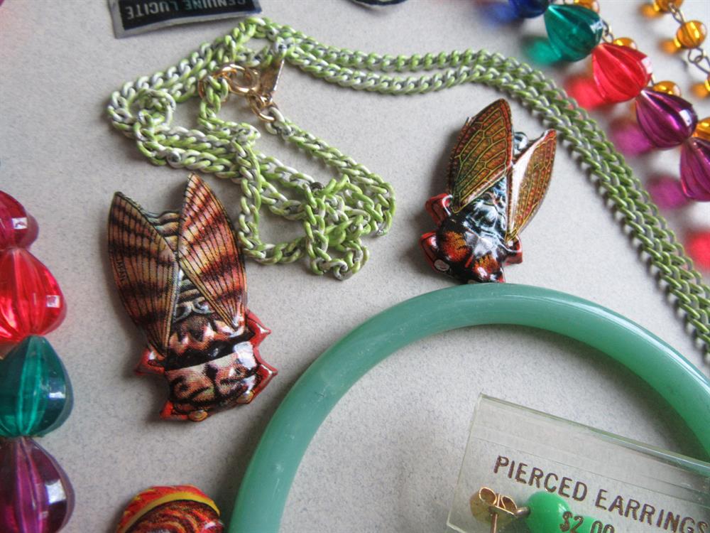 Vintage jewelry lot which consists of two lucite necklace, one with original lucite tag, a glass bracelet, mod orange pierced earrings, mod pierced green earrings on their original card, a Monet signed antiqued finish green and white metal tassel necklace and throwing in five very thin tin litho pins with primitive pin backs. All in wonderful shape.