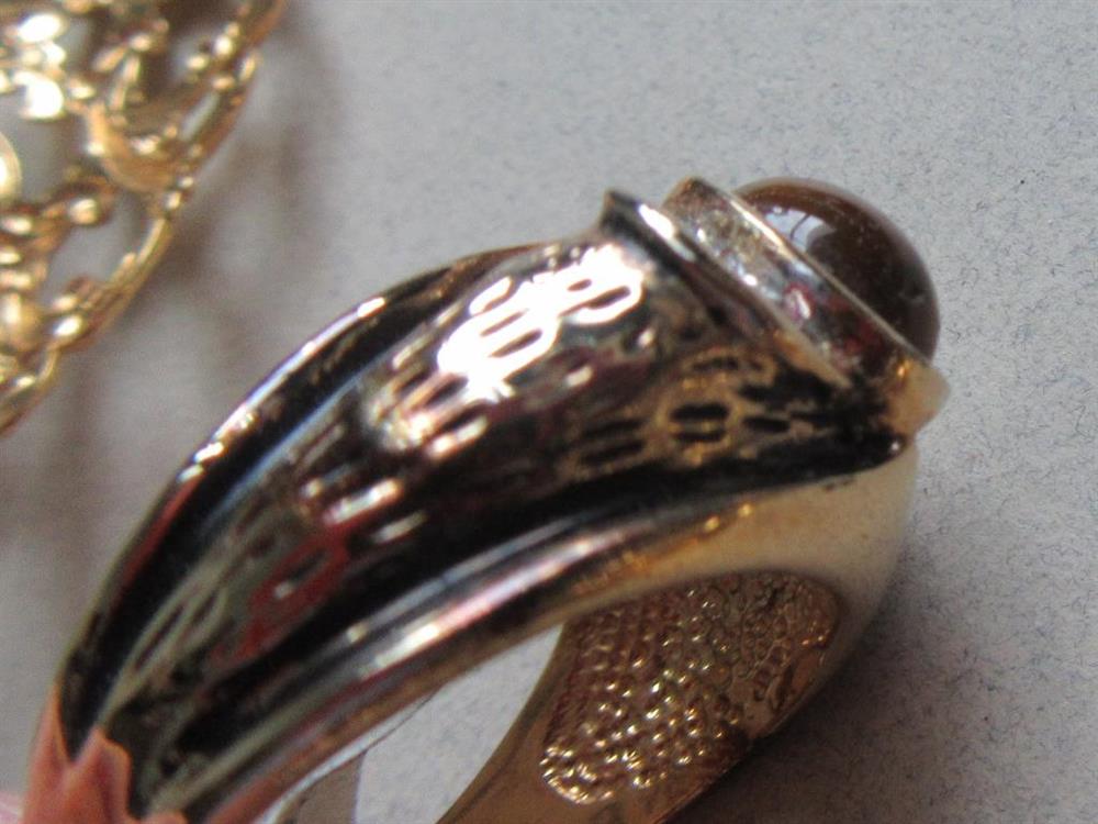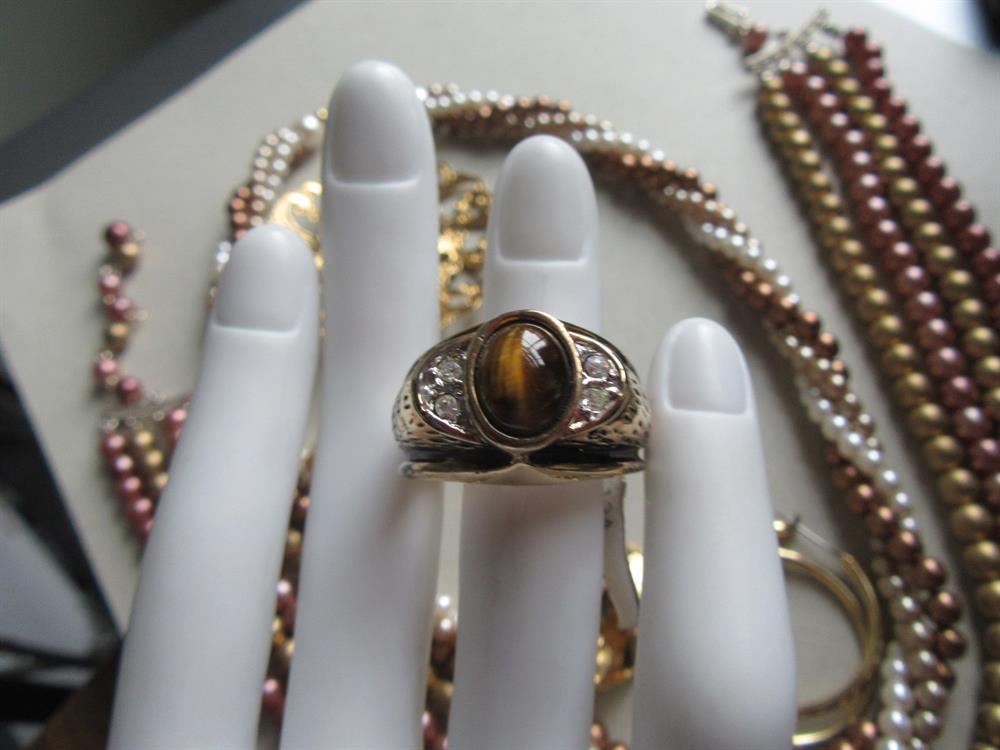 Tiger Eye men's ring- Never worn. Marked gold electro plate. It has a tiger eye front and rhinestones on either side of side. Has the with original tag. Size 11. It has some darkness on the sides. not sure if it will clean up.