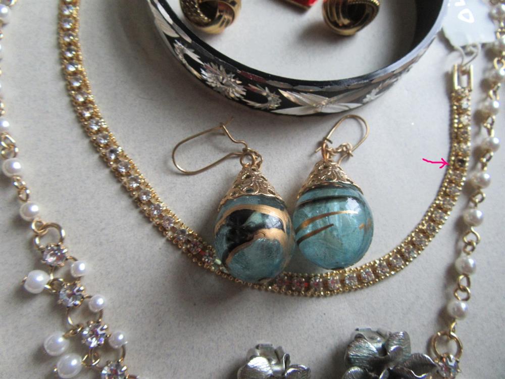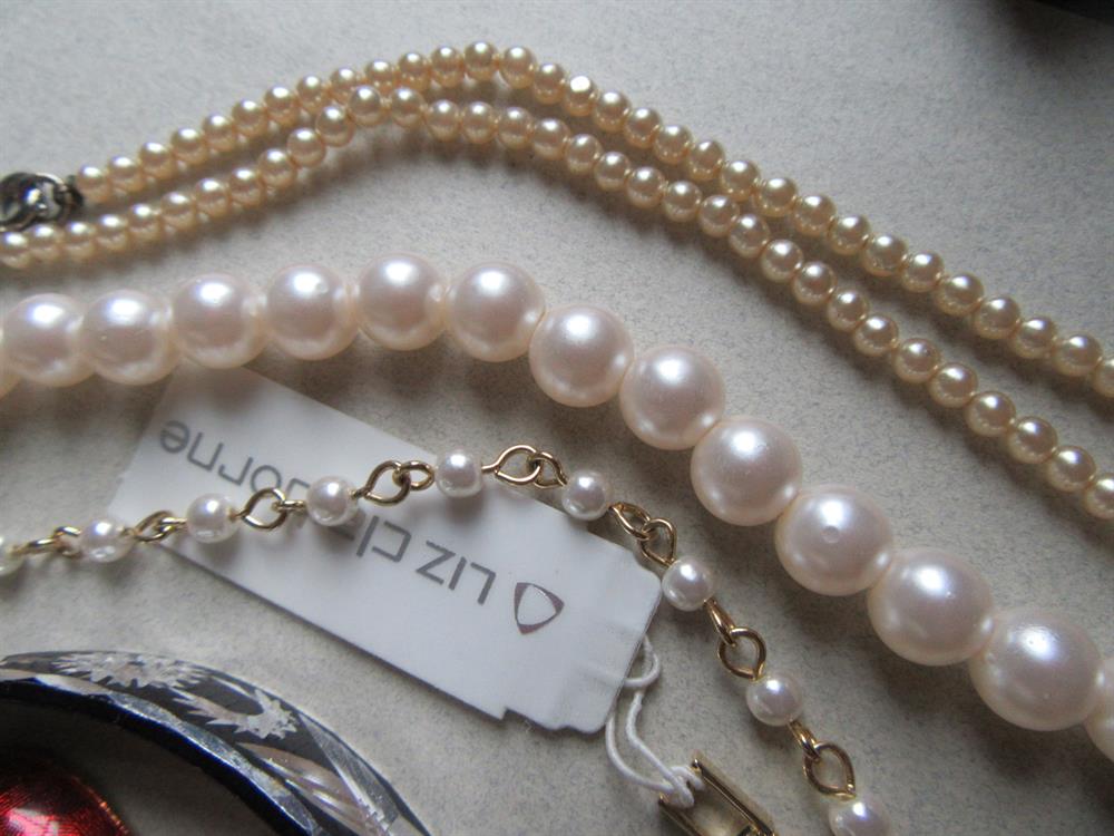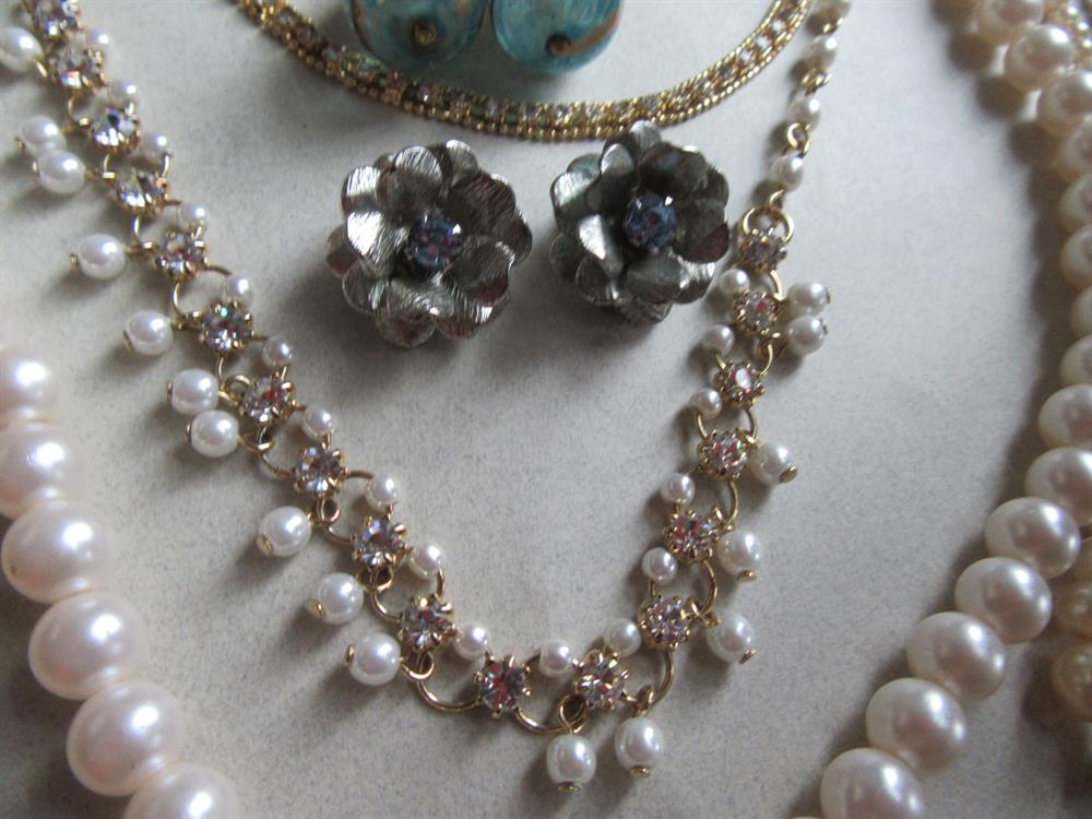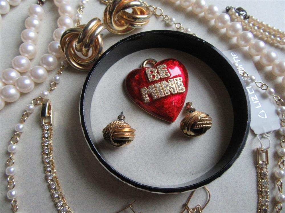 Vintage jewelry lot. The three pieces in this lot that are not vintage is the dangle goldstone faux pearl necklace, the Be Mine red heart charm and the rhinestone tennis bracelet with Liz Claiborne tag..