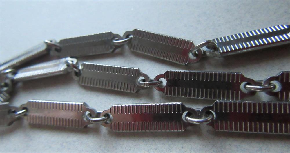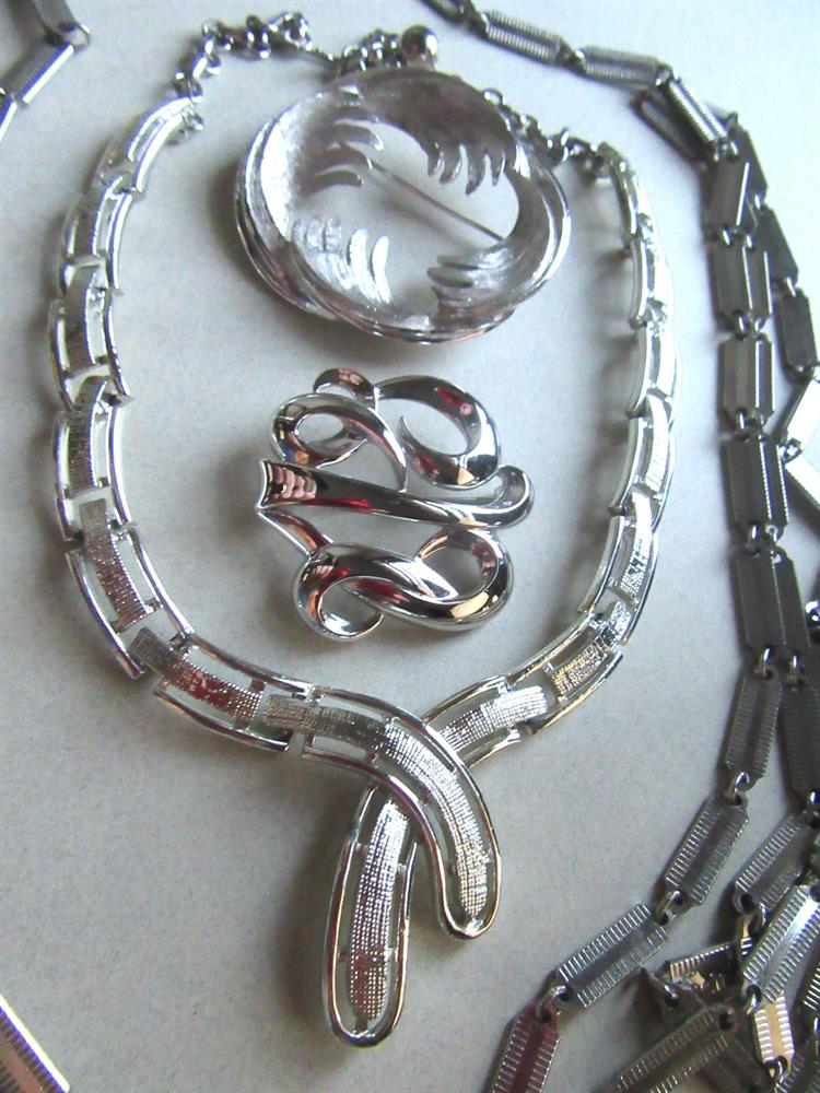 Vintage silver tone jewelry lot. Which consists of the following: Chrome? heavy textured link long chain - 54" long Pastelli signed pin - 2" across. Pin shaft has a slight wave, no big deal Monet signed modern style pin Silver tone textured choker necklace - 17" long All in fabulous shape.
