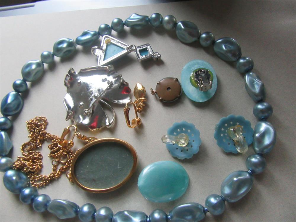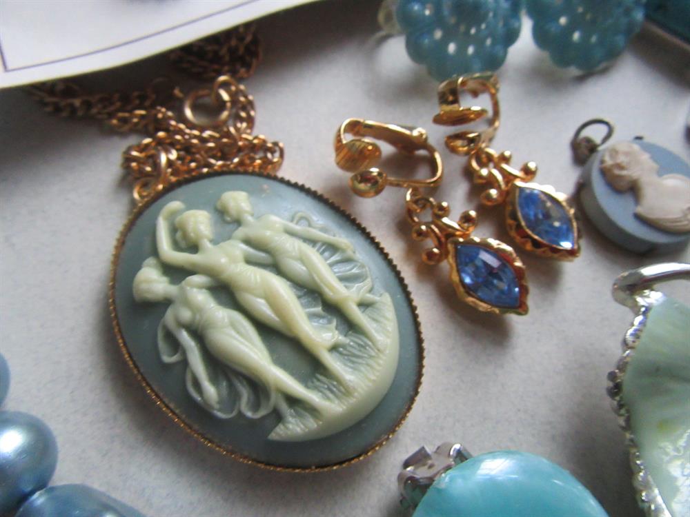 Vintage jewelry lot. The blue pop it beads measure 20" long, Four pairs of earrings. Four pairs are clips, one is a 1940's plastic slide on backs (made during WWII when using metal was a no-no), and one pair of pierced newer earrings. A faux cameo necklace, rhinestone leaf pin, small faux cameo pendant that needs a bath, and a newer faux turquoise triangular pendant.