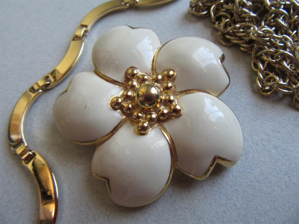 Vintage jewelry lot. The egg yolk lucite tear drop necklace is signed Sarah Coventry. A heart pin, enameled flower pin signed Monet, a gold tone link necklace and throwing in the small saxophone pin. All in great shape!