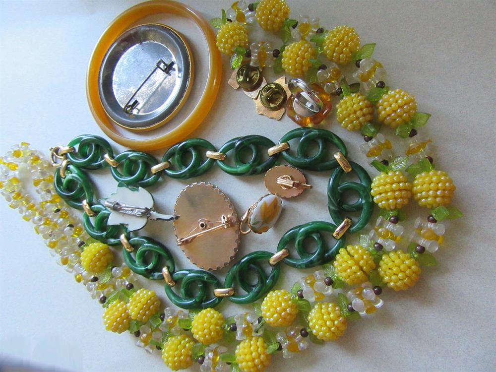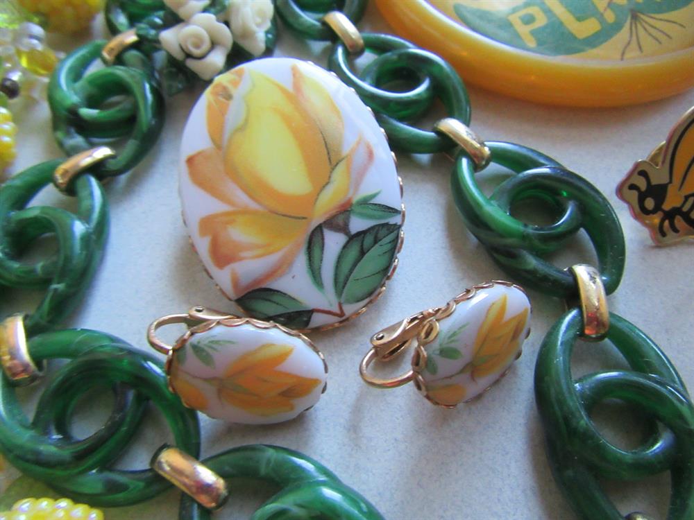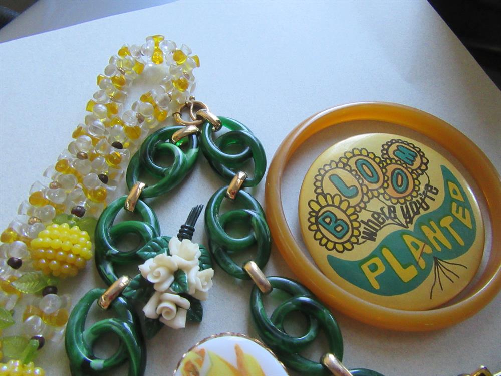 Vintage jewelry lot in yellows and greens. The lucite green choker necklace in the center is VERY short and is signed Napier. A fruit salad berry necklace, a yellow rose glass transfer pin with matching clip earrings, a lucite bangle, two bee tac pins, a lucite flower ring and throwing in the "Bloom Where Your Planted" finback pin that has yellowed over the years and has a dark back.