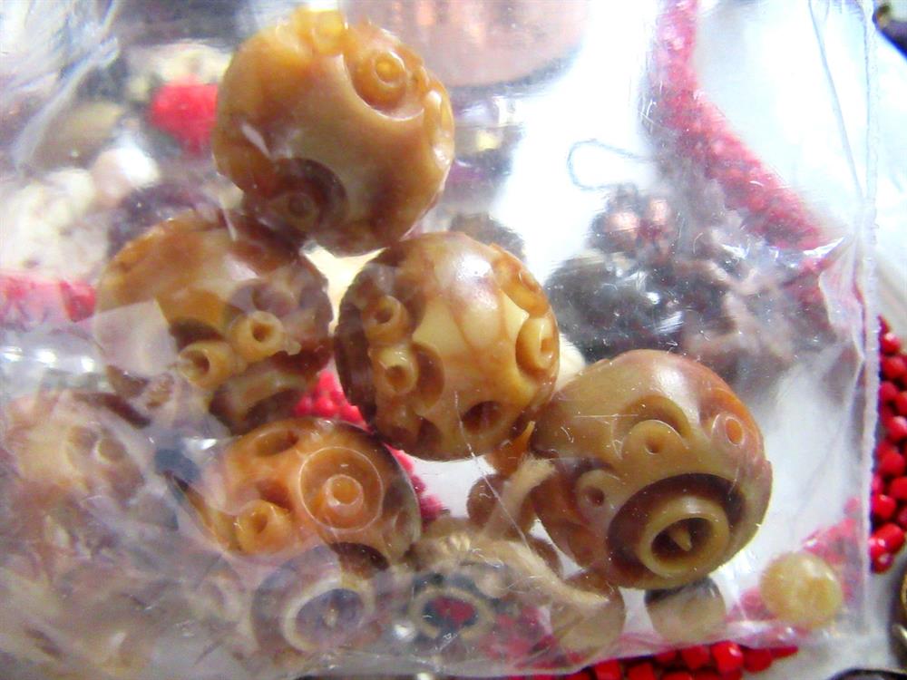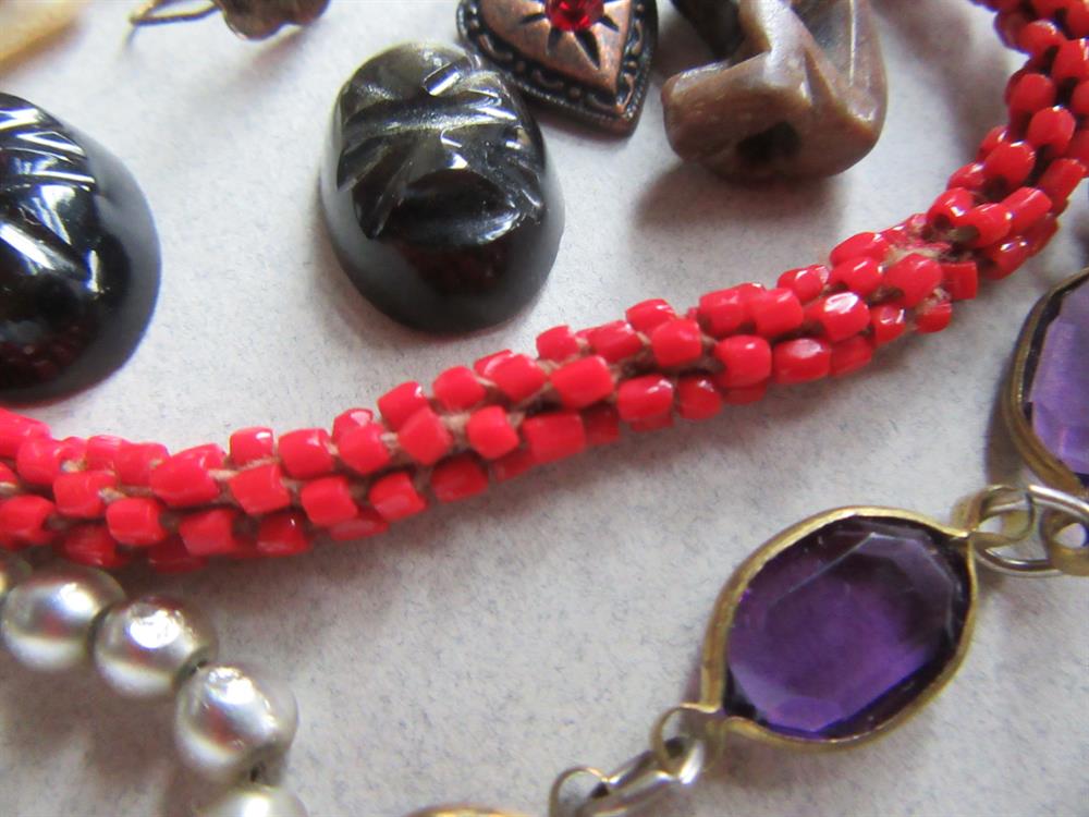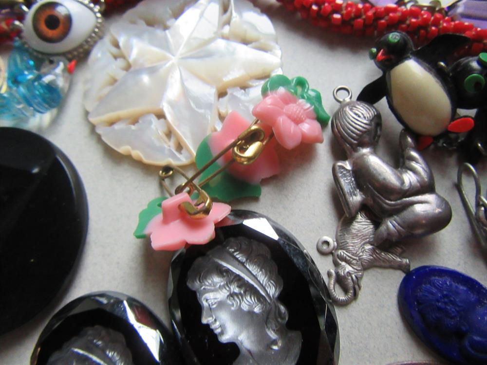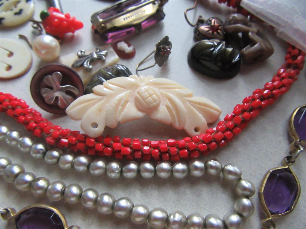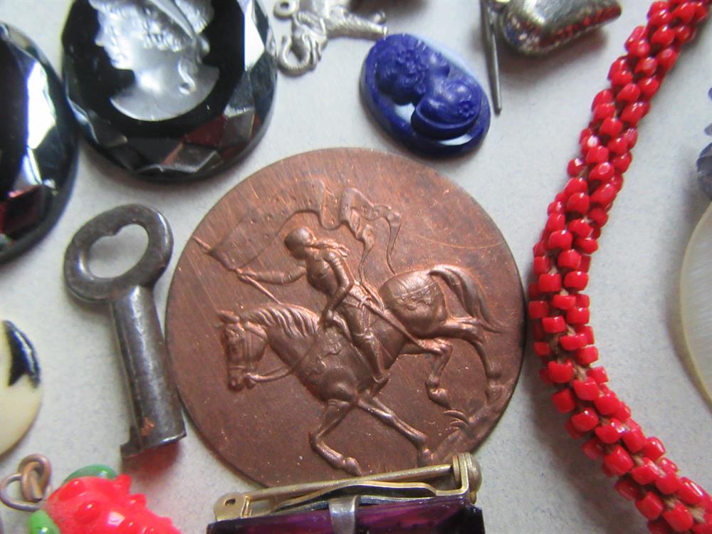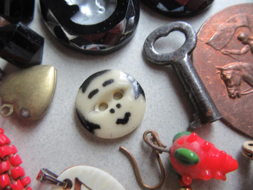 What you see is what you will receive. The molded beads in the bag are celluloid. The round black glass piece is part of a buckle and signed Czechoslovakia. Vintage buttons, bits and pieces, glass cameos, copper stamping of Joan of Arc? and more.