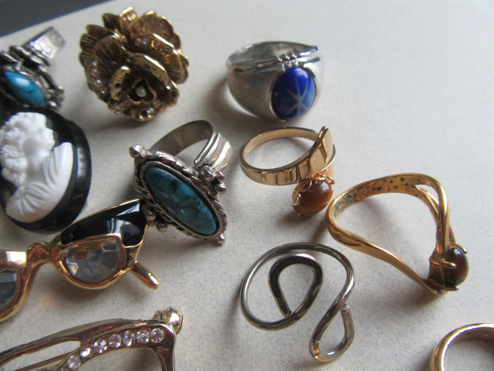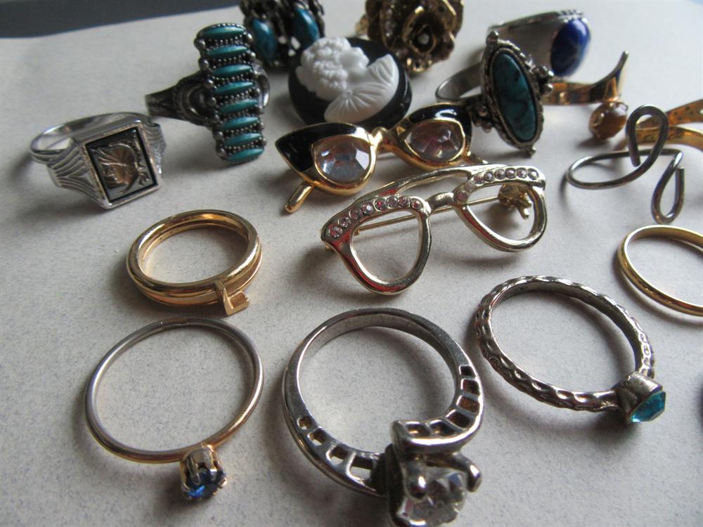 Vintage costume junk rings lot and a few pins.