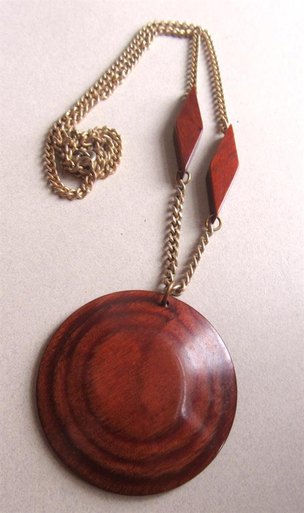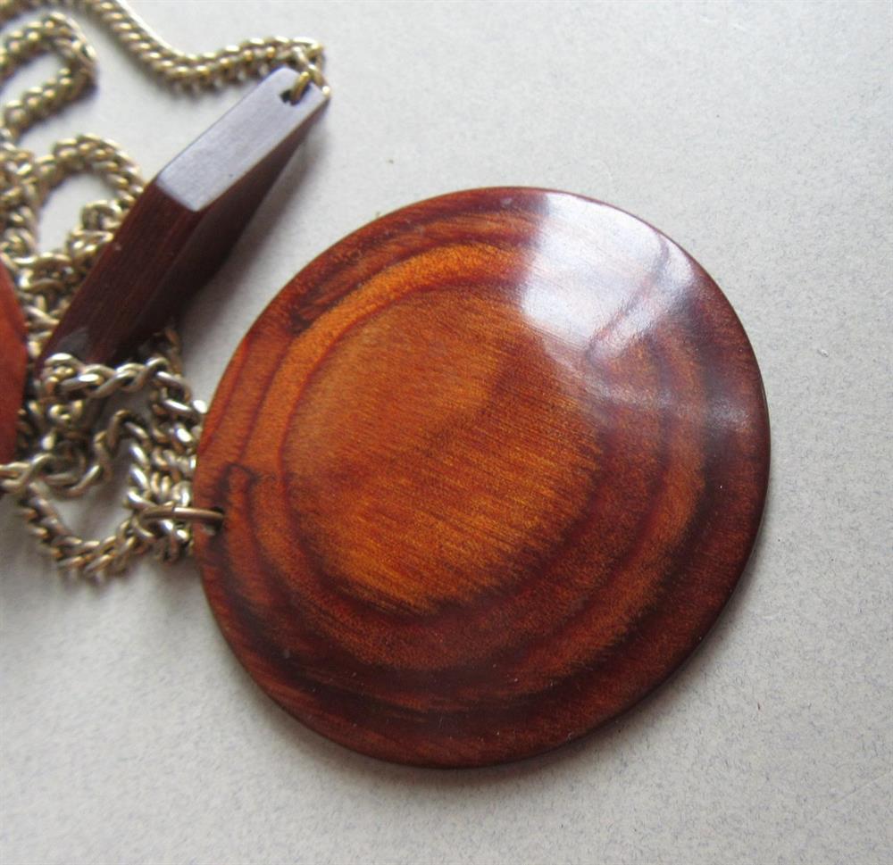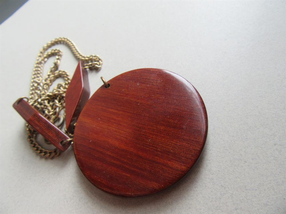 Vintage mid century bakelite infused wood (or phenolic bakelite) necklace. The pendant measures 2 1/8