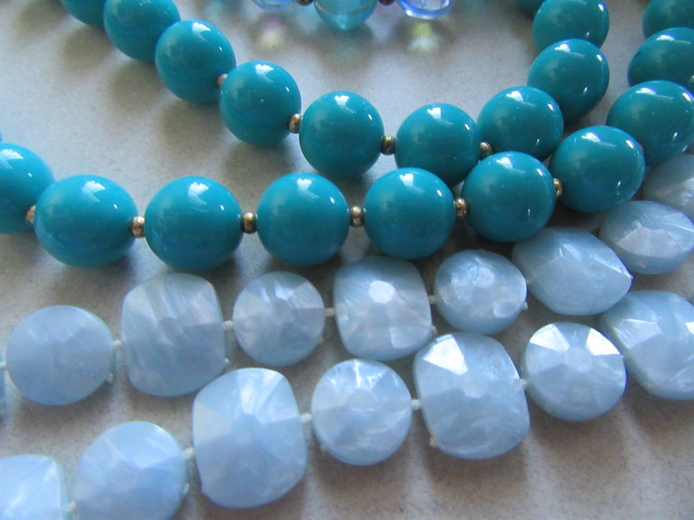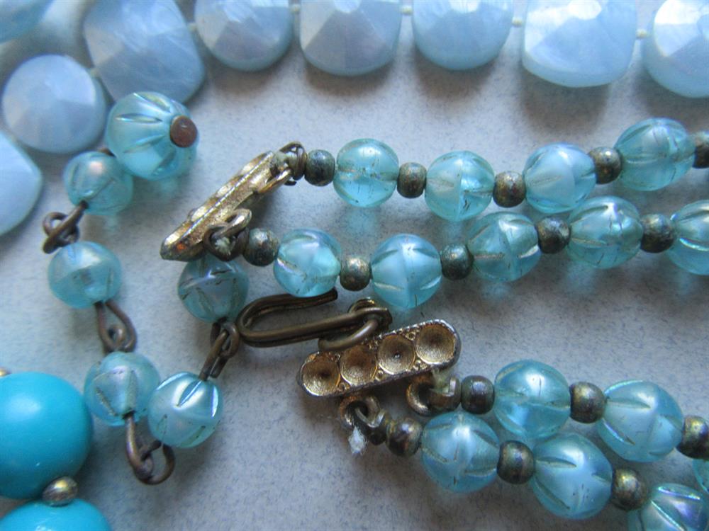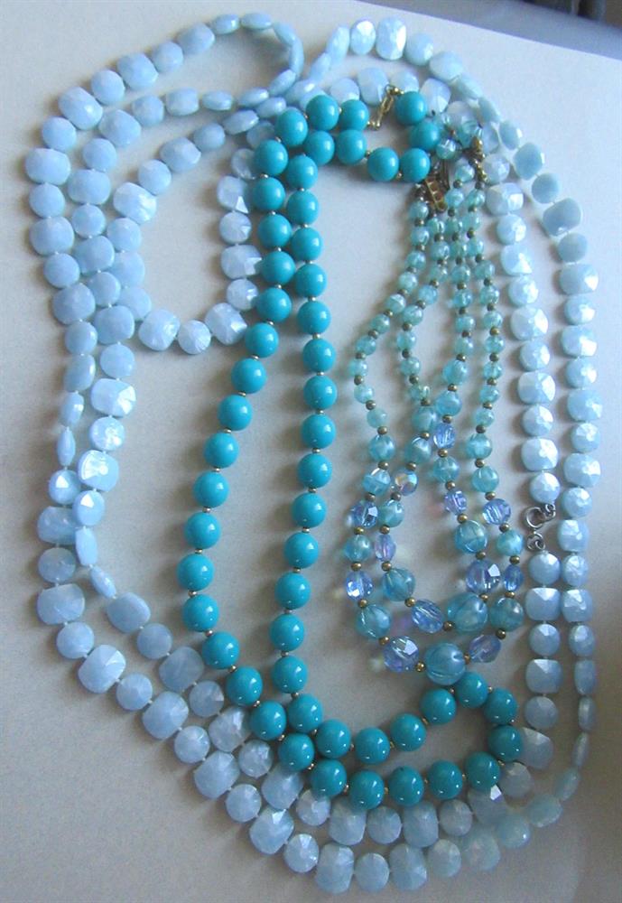 Vintage 1960's mod long baby blue necklace that measuresapprox 60" " long. A 24" turquoise lucite necklace and I am throwing in the 1950's glass choker necklace that has some wear that has some missing rhinestones in the clasp ends. Other necklaces are in excellent shape,